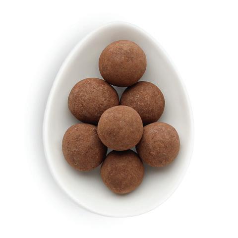 A crunchy shell of French dark chocolate and roasted hazelnut pieces with a soft center.