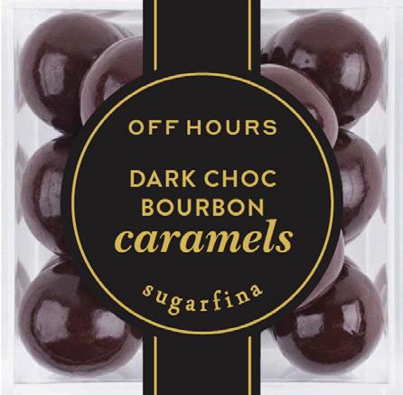 These rich dark chocolate-covered caramels are infused with the smooth flavor of Off Hours bourbon for just the right amount of kick.
