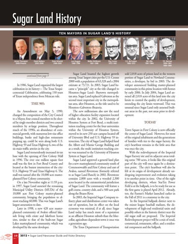 continued from page 9 In 1986, Sugar Land organized the largest celebration in its history— The Texas Sesquicentennial Celebration, celebrating 150 years of Texan independence from Mexican rule.