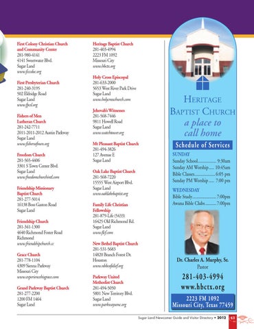 281-403-4994 www.hbctx.org 2223 FM 1092 Missouri City, Texas 77459 Sugar Land Newcomer Guide and Visitor Directory • 2012
