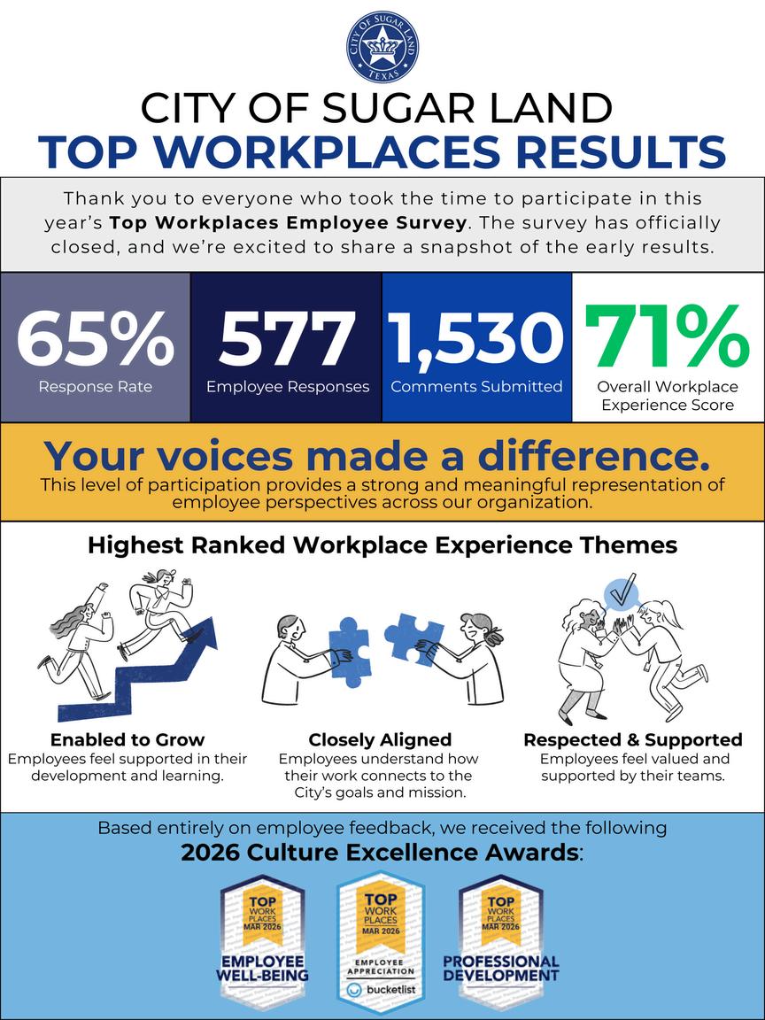 Thanks to YOUR feedback, Sugar Land has earned THREE 2026 Culture Excellence Awards: Top Employee Well-Being, Top Employee Appreciation, and Top Professional Development