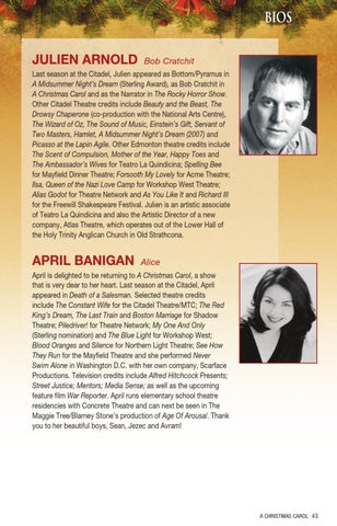 April is delighted to be returning to A Christmas Carol, a show that is very dear to her heart. Last season at the Citadel, April appeared in Death of a Salesman. Selected theatre credits include The Constant Wife for the Citadel Theatre/MTC; The Red King’s Dream, The Last Train and Boston Marriage for Shadow Theatre; Piledriver! for Theatre Network; My One And Only (Sterling nomination) and The Blue Light for Workshop West; Blood Oranges and Silence for Northern Light Theatre; See How They Run for the Mayfield Theatre and she performed Never Swim Alone in Washington D.C. with her own company, Scarface Productions. Television credits include Alfred Hitchcock Presents; Street Justice; Mentors; Media Sense; as well as the upcoming feature film War Reporter. April runs elementary school theatre residencies with Concrete Theatre and can next be seen in The Maggie Tree/Blarney Stone’s production of Age Of Arousal. Thank you to her beautiful boys, Sean, Jezec and Avram!