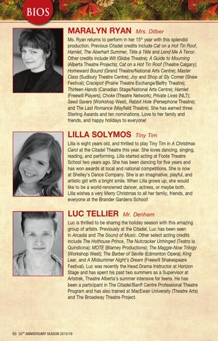 Ms. Ryan returns to perform in her 15th year with this splendid production. Previous Citadel credits include Cat on a Hot Tin Roof, Hamlet, The Aberhart Summer, Tête á Tête and Lend Me A Tenor. Other credits include Wit (Globe Theatre); A Guide to Mourning (Alberta Theatre Projects); Cat on a Hot Tin Roof (Theatre Calgary); Homeward Bound (Grand Theatre/National Arts Centre); Master Class (Sudbury Theatre Centre); Joy and Shop at Sly Corner (Shaw Festival); Crackpot (Prairie Theatre Exchange/Belfry Theatre); Thirteen Hands (Canadian Stage/National Arts Centre); Hamlet (Freewill Players); Choke (Theatre Network); Private Lives (NLT); Seed Savers (Workshop West), Rabbit Hole (Persephone Theatre); and The Last Romance (Mayfield Theatre). She has earned three Sterling Awards and ten nominations. Love to her family and friends, and happy holidays to everyone!