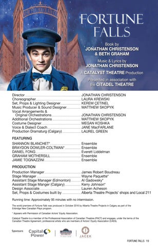 Director................................................................ Jonathan Christenson Choreographer. . .................................................. Laura Krewski Set, Props & Lighting Designer. . ...................... Kerem Çetinel Music Producer & Sound Designer................. Matthew Skopyk Vocal Arrangements & Original Orchestrations.................................. Jonathan Christenson Additional Orchestrations................................. Matthew Skopyk Costume Designer............................................. Megan Koshka Voice & Dialect Coach. . ..................................... Jane MacFarlane Production Dramaturg (Calgary)...................... Laurel Green Featuring Shannon Blanchet*................................... Ensemble Braydon Dowler-Coltman*................... Ensemble Daniel Fong.................................................... Everett Liddelman Graham Mothersill................................... Ensemble Jamie Tognazzini.......................................... Ensemble Production Production Manager.......................................... James Robert Boudreau Stage Manager................................................... Wayne Paquette* Assistant Stage Manager (Edmonton)............ Al Gadowsky* Assistant Stage Manger (Calgary)................... Kerry Johnson* Design Associate. . .............................................. Lauren Acheson Set, Props & Costumes built by...................... Alberta Theatre Projects’ shops and Local 211 Running time: Approximately 95 minutes with no intermission. The world premiere of Fortune Falls was produced in October 2016 by Alberta Theatre Projects in Calgary as part of the Enbridge New Canadian Plays program. * Appears with Permission of Canadian Actors’ Equity Association. Catalyst Theatre is a member of the Professional Association of Canadian Theatres (PACT) and engages, under the terms of the Canadian Theatre Agreement, professional artists who are members of Actors’ Equity Association (CAEA).