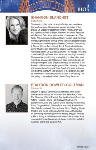 Braydon is a proud Edmonton-based theatre artist. Select theatre credits include A Christmas Carol, Peter Pan, Oliver!, The Pillowman (Citadel Theatre); Burning Bluebeard (Edmonton Actor’s Theatre); Fortune Falls (Catalyst Theatre/ATP); Scaramouche Jones and Subway Circus (Blarney Productions); That’s Danger (AWHC); Tarzan (Broadway Live); Passion Play (Wild Side Productions); Bloody Poetry, Blood Wedding (Studio Theatre); and the co-written/performed piece, A Perspective on Something Important (Edmonton Fringe). Braydon received a BFA in Acting at the University of Alberta. He is thrilled to be returning to this exciting ensemble-based production, with the incredible talents that surround him.