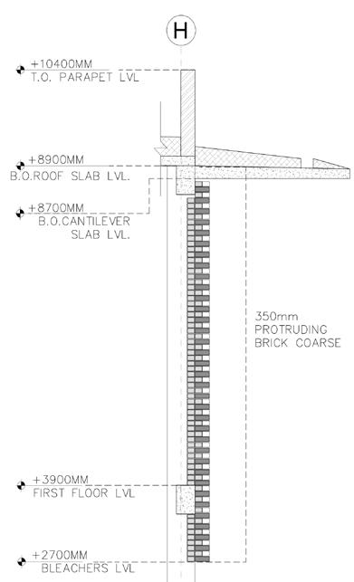 Projection of brick course works as a double skin, by running the brick on the edge and projecting it by 75mm from the wall, a continuous self shading wall is formed, cutting the heat gain.