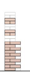 A series of brick projections that are denser at the bottom and sparser as they rise are organized in three equally spaced courses that accentuate the verticality of the buildings and distinguish between the ground plane and the top of the building. Collectively they define the formal language of the project’s elevations.
