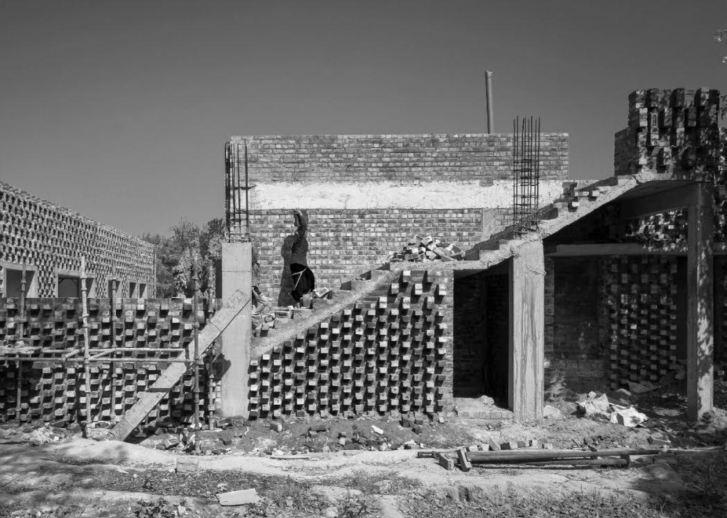 The structure is differentiated by applying five different coursing details with varying perforations and projections, which bring a textured look to the architecture while helping to keep the walls cool by casting shadows. The degree of shade and type of shadow varies