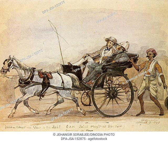 Fig. 13 shows a European Lady carried in her jhampani (sedan). Each jhampan required at least five to six people to carry it, and the women travelled with their convoy who carried their belongings on their travels. Fig 14. Shows a British man on a tonga, driven by a horse. The