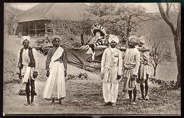 Fig. 13: A European Lady carried in her Jhampan (sedan), Library of Louisiana State University, Imperial Diversions: Postcard, (Umballa: Herman Das & Sons, !890s)
