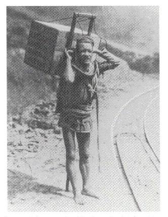 Fig. 12: Coolie (Porter) carrying luggage on a mountain road, Kennedy, The Magic Mountains, (University of California Press, 1996), p 189.