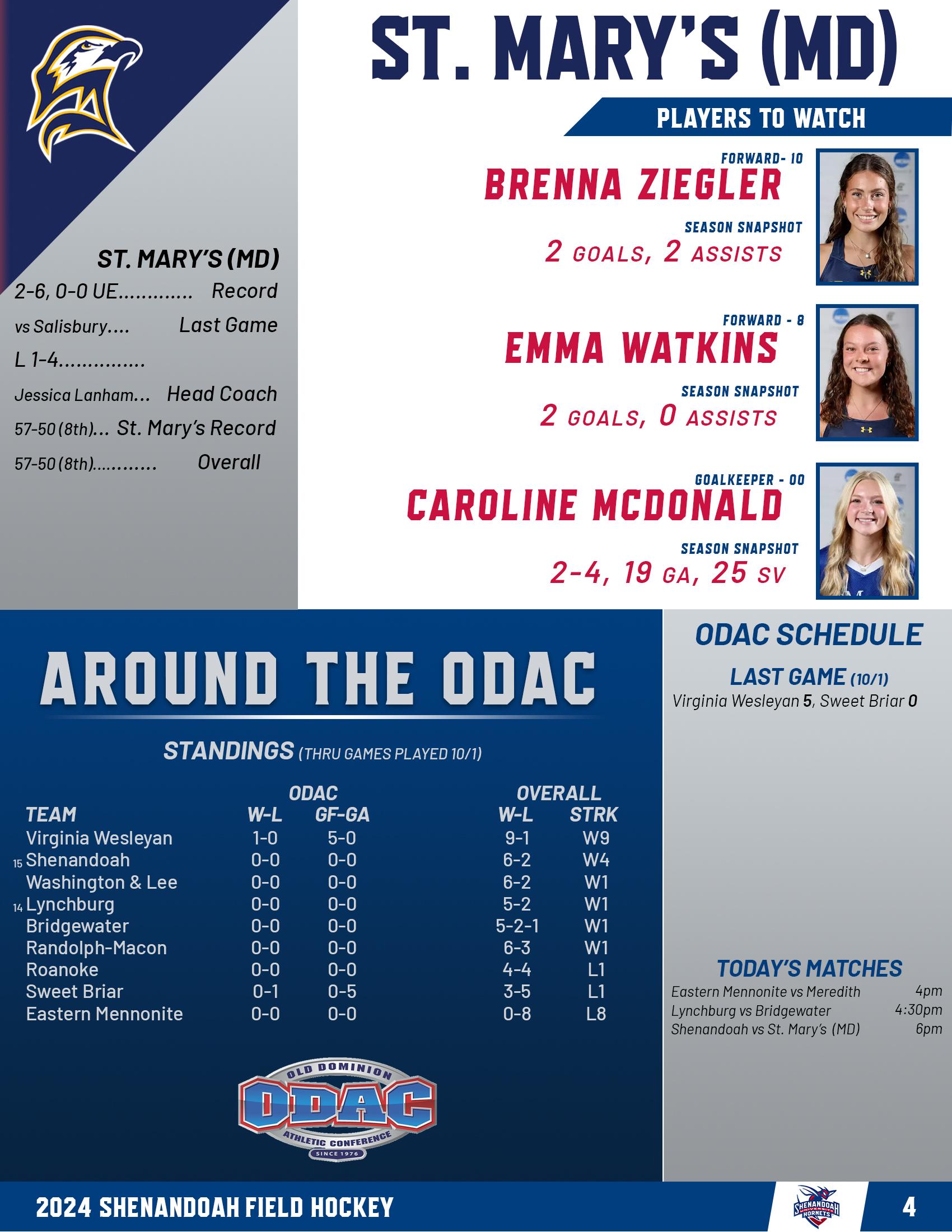 SU Field Hockey vs St. Mary's (MD) Gameday Program