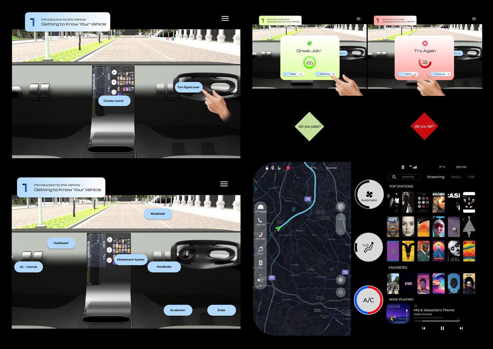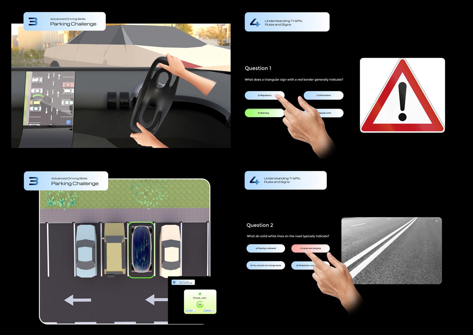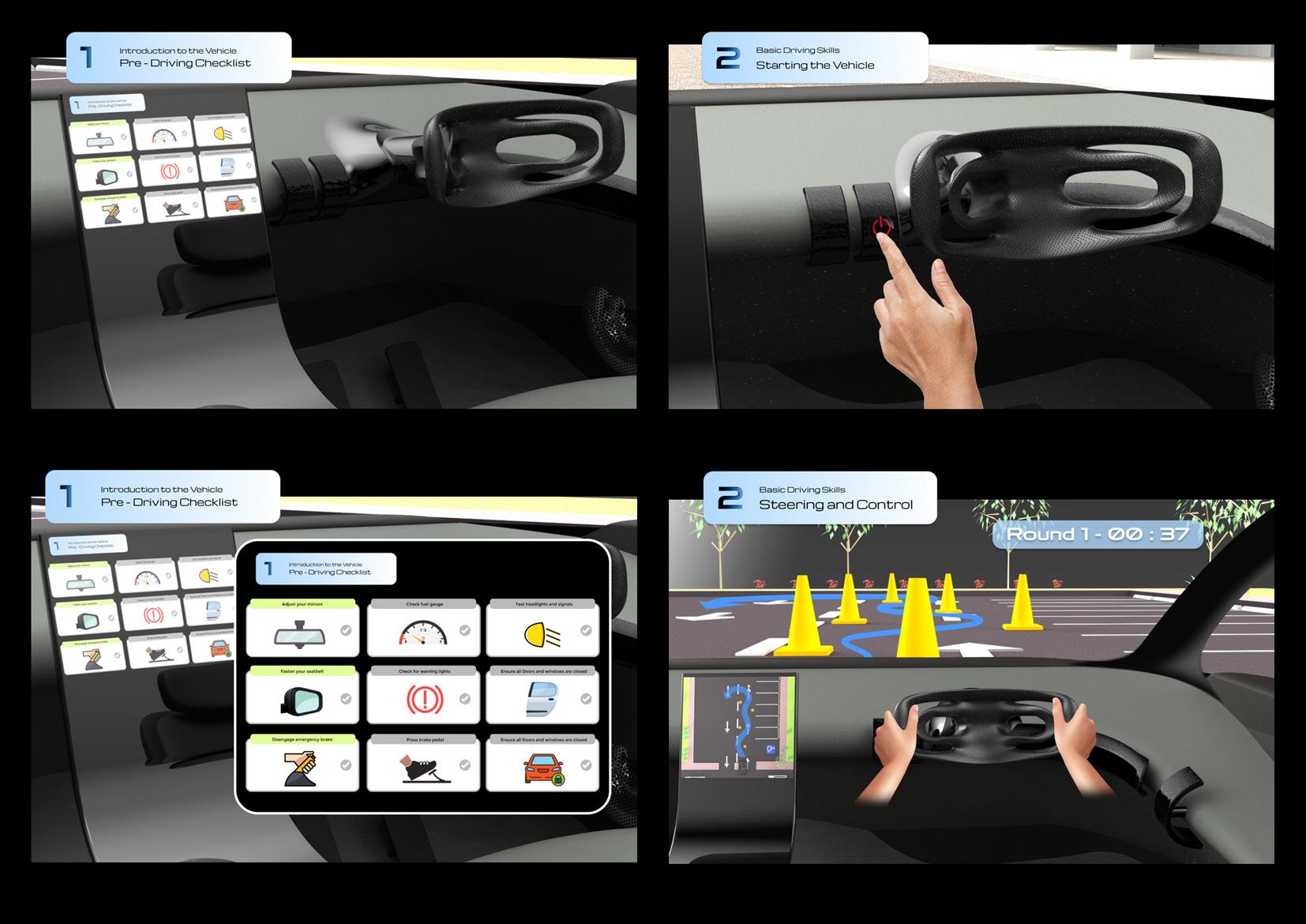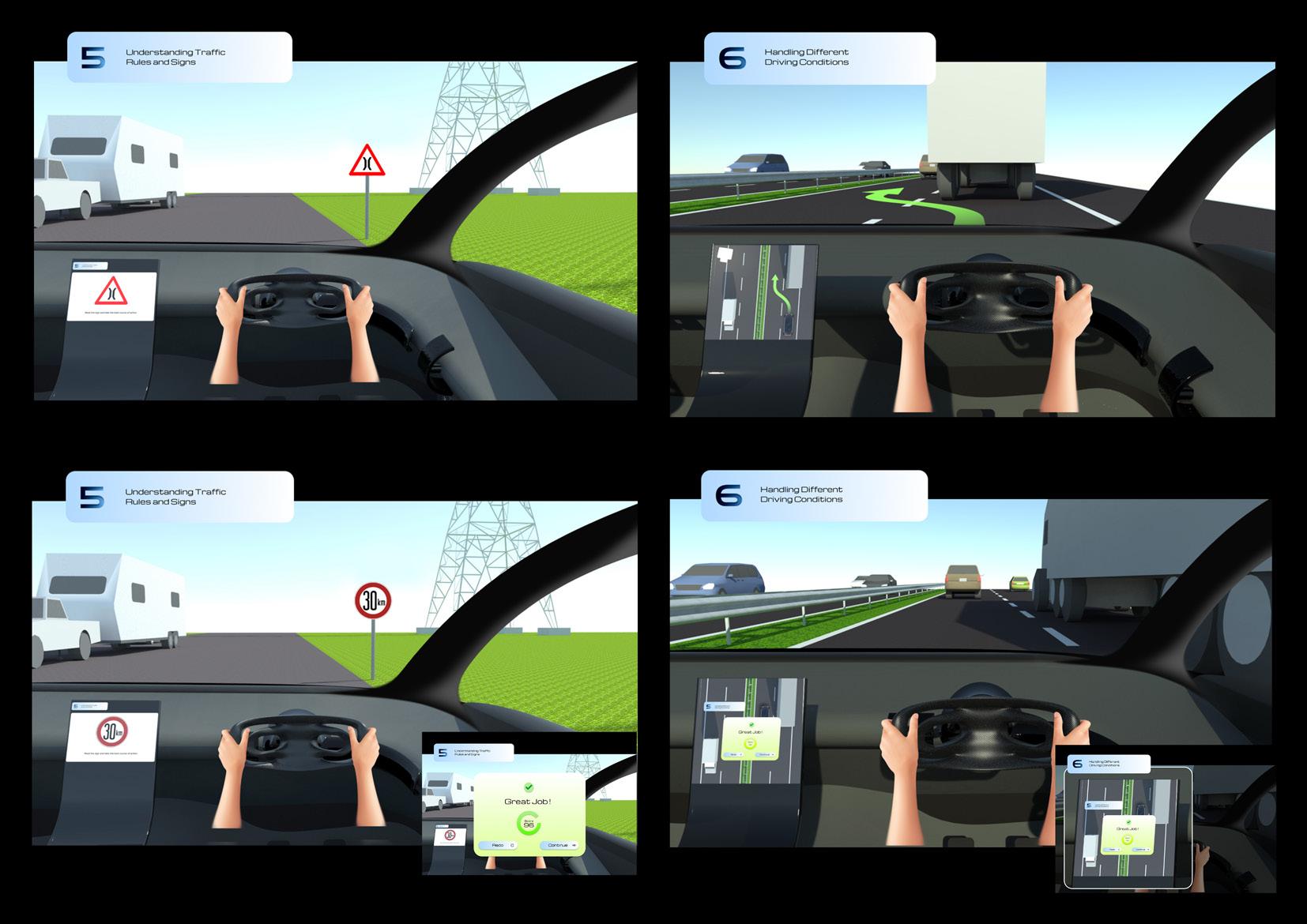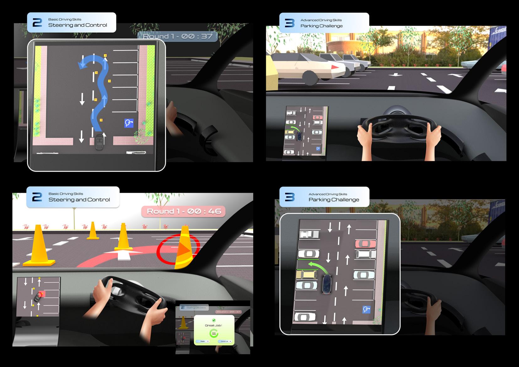 The Oled Screen simulates various sitautions the users would face in the real world. The user has to think practically on the spot and take the best decision possible. This enhances their on the spot thinking and would they would already be well conditioned once they drive through similar scenarios.