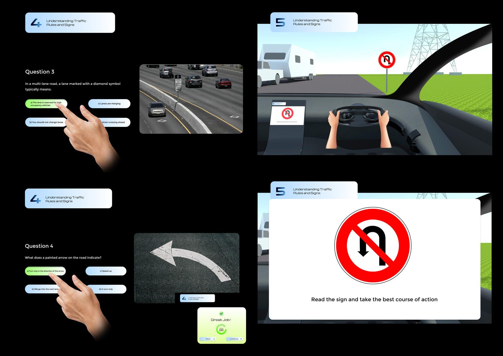 The lesson modules includes a quiz challenging the users knowledge on some important points to remember while driving.
