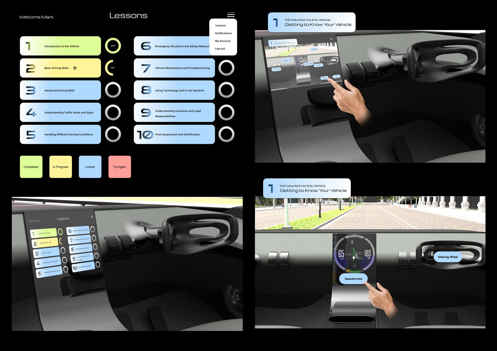 The lesson training tries to use visual ques rather than audible or textual feedback so that the driver can focus on completeing the objectives. I feel that this is a more practical way to learn as their skills develop throug trial and error.