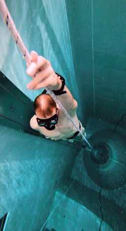 Kääntyminen, paineentasaus ja taitto − matka kohti pohjaa alkoi. Jonkin ajan kuluttua avasin silmäni ja näin seinäkaakelissa merkinnän ”-25 m”. Pari potkua, käännös ja takaisin pintaan. Pintaprotokollan jälkeen loin katseen kellooni: 25,9 metriä, kurssisuoritus hyväksytty!