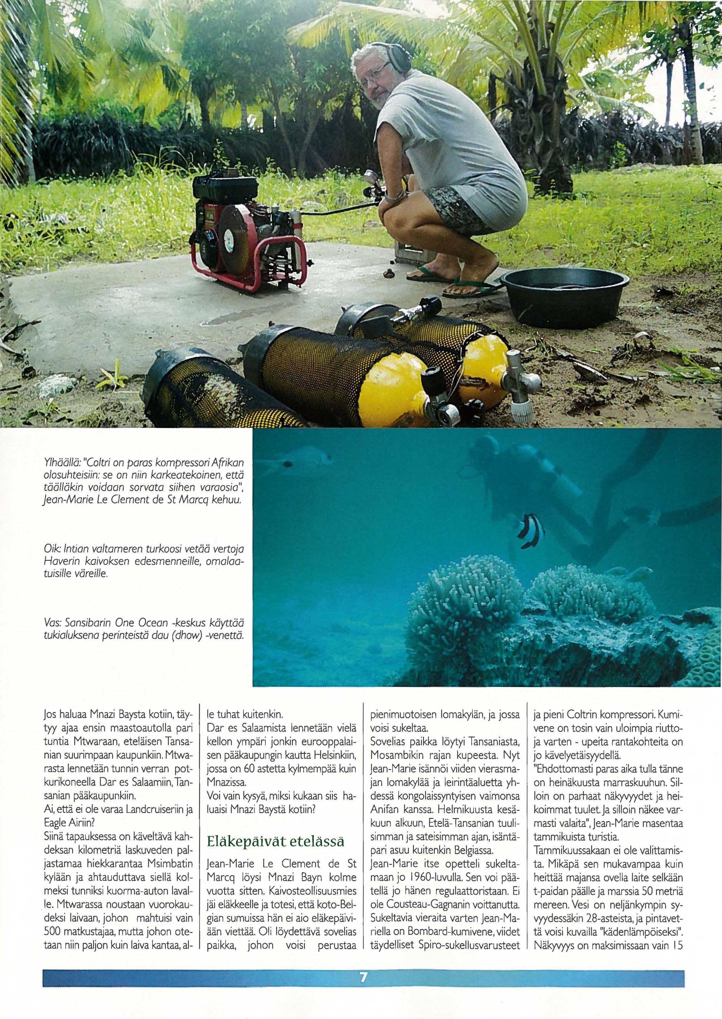 pienimuotoisen lomakylän, ja jossa voisi sukeltaa Sovelias paikka löytyi Tansaniasta, Mosambikin rajan kupeesta. Nyt jean-Marie isännöi viiden vierasmajan lomakylää ja leirintäaluetta yhdessä kongolaissyntyisen vaimonsa Anifan kanssa. Helmikuusta kesäkuun alkuun, Etelä-Tansanian tuulisimman ja sateisimman ajan, isäntäpari asuu kuitenkin Belgiassa. jean-Marie itse opetteli sukeltamaan jo I 960-luvulla. Sen voi päätellä jo hänen regulaattoristaan. Ei ole Cousteau-Gagnanin voittanutta