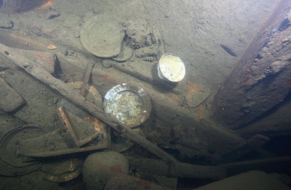 Perässä paapuurin puolella rikkinäisen laidan alla pilkistää joku messinkinen koneisto metrisen varren päässä. Mikäköhän senkin tehtävä on ollut? Ei se oikein kompassiltakaan näyttänyt. Peräsimen ihailun jälkeen voikin sitten nousta ylös ruuman päälle ja tarkastaa irralliset lautaset styyrpuurin puolella ja lautaskasat toisella puolella. Rautaisen uunin päälle joku koiraleuka on nostanut ison saviruukun. Niin ikään rautainen iso hella löytyy vähän edempää.