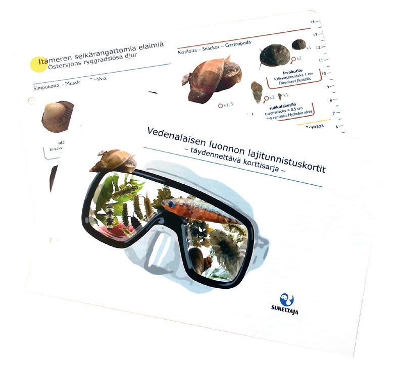 SUKELTAJALIITTO julkaisee Suomen vedenalaista elämää esittelevän lajintunnistuskorttien sarjan. Ensimmäiset kortit esittelevät Itämeren leviä, putkilokasveja ja selkärangattomia eläimiä. Kansioon kuuluvat kuvalliset kortit sekä tekstisivut, joissa on tarkempia tietoja liittyen korttien kuviin. Kortit on suunniteltu vedenalaiseen käyttöön ja kansio kestää sukelluskassin märät varusteet. Hinta 20 euroa. sukeltaja.fi > verkkokauppa
