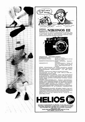 NIKONOS III - TEKNISET TIEDOT KAMERATYYPPI : 35 mm : n kamera KUVAKOKO / FILMI : 24.x 36 mm (normaali 12, 20 tai 36 kuvan kasetti ) OBJEKTIIVINKIINNITYS : jousin varustettu bajonetti kiinnitys OBJEKTIIVIT : normaaliobjektiivi : Nikkor 35 mm f!2 .5, kolme muuta objektiivia superlaajakulmasta te leeseen . ETSIN Helokehäetsin, 0,61 kertaa suurentava, etsinala 84%, 35 mm: n ja 80 mm: n kirkkaat kehät, parallaksin korjausmerkinnät lähikuvaukseen, -0,5 dptr perus korjaus. SULJIN Pystysuoraan liikkuva metalliverhosuljin. SULJINAJAT B, 1 / 30, 1 / 60, 1 / 125, 1/250 ja 1/500 sek ., tasaisesti porrastetuin välein . FILMINSIIRTO JA LAUKAISU Sama vipu siirtää filmiä ja kuvaniaskinta , virittää ja laukaisee sulkimen . Kääntymiskulma 73° . Vivussa on lukko sekä laite, joka estää lau kaisun, mikäli kamera ei ole kokonaan virittynyt. Laukaisukulma 6 fl 30' . FILMIN T AKAISINKELAUS Taittuva takaisinkelauskampi. Filmin takaisinkelauksen osoitin näkyy kuvanIaskinikkunasta. Suljinaika-asteikko on säädettävä takaisinkelauksen ajaksi asentoon "R" (rewind = takaisinkel. ). KUVANLASKIN Automaattisestinollautuva, lisäävä . LISÄ V ARUSTEISTUKKA Sijaitsee kamerarungon päällä. SALAMATÄSMÄ YS Fp· ja X -täsmäys, vedenpitävä kos· ketin. PAINEENKESTO 50 metriin (160 jalkaa) saakka (6 kg / cm 2 ) SYÖPYMISENKESTO Sekä rungon sisä- että ulkopuoli on valmistettu syöpymisenkestävästä metallisekoituksesta ja lasikuidulla vahvistetusta polyetyleenikarbonaatista . MITAT leveys 144 mm, korkeus 99 mm, syvyys 47 mm, paino 620 g (runko)