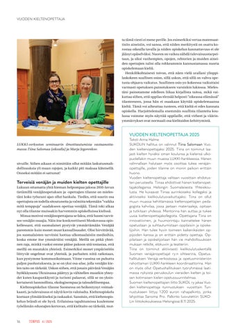 SPRÅKUNDERVISNINGEN är viktigare än någonsin. Språket är en bro mellan mänskor och kulturer, och språklärarna utför dagligen ett viktigt arbete för att bygga denna bro. Därför är det en sann glädje och ära att lyfta fram dem, som på ett unikt sätt främjat språkens ställning i Finland. SUKOL gav även i år utmärkelserna Årets språkgärning och Årets språklärare. Prisen är för oss en påminnelse om att det är en livskraftig och socialt anmärkningsvärd handling att modigt använda språk. För Årets Språkgärning premieras en person, ett projekt eller ett samfund som på ett exceptionellt vis har främjat språkens ställning och uppskattning i Finland. Priset Årets språklärare delas ut till en lärare, som i sitt arbete har visat prov på engagemang, kreativitet och förmåga att inspirera elever att upptäcka språkens värld. Mottagarna av dessa utmärkelser visar att en enskild lärare eller handling kan ha en enorm betydelse för all språkundervisning. Det är viktigt att vi ibland stannar upp för att fira dessa prestationer – inte enbart som enskilda ärebetygelser utan som gemensamma segrar för hela branschen.