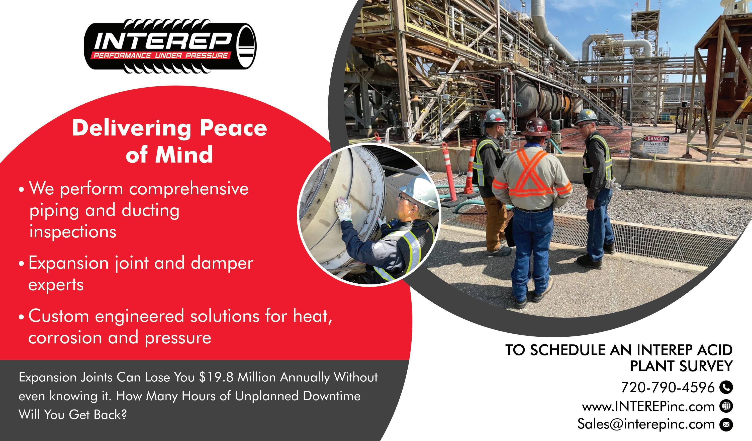 I would like to welcome our new and returning Sulfuric Acid Today advertisers and contributors, including: Acid Piping Technology Inc., Acuity Commodities, Alphatherm, BASF, Beltran Technologies, Branham Industrial, Central Maintenance & Welding, CG Thermal, Chemetics, Christy Catalytics, Clark Solutions, Elessent MECS Technologies, LacMac GORE-TEX, INTEREP, Knight Material Technologies, Mercad Equipment Inc., NORAM Engineering & Constructors, Southwest Refractory of Texas, Spraying Systems Co., VIP International, and Weir Minerals Lewis Pumps.
