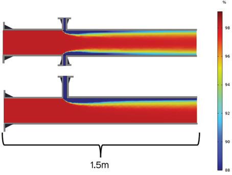 In an effort to better utilize the pipe volume for dilution, the next step is using multiple water feed pipes. After all, as seen in concentration profiles shown earlier, dilution is most intense near the water