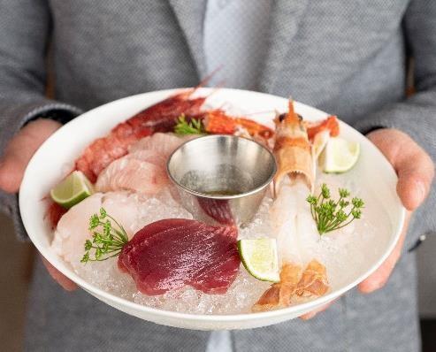 Arrostino di vitello in carpaccio con crudo di tonno aromatizzato capperi e caviale di uovo Insalata verdure in agrodolce con julienne di lingua di vitello affumicata