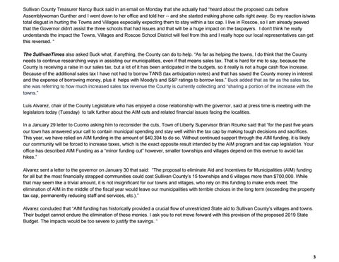 Sullivan County Treasurer Nancy Buck said in an email on Monday that she actually had “heard about the proposed cuts before Assemblywoman Gunther and I went down to her office and told her -- and she started making phone calls right away. So my reaction is/was total disgust in hurting the Towns and Villages especially expecting them to stay within a tax cap. I live in Roscoe, so I am already peeved that the Governor didn't assist the three schools that had issues and that will be a huge impact on the taxpayers. I don't think he really understands the impact the Towns, Villages and Roscoe School District will feel from this and I really hope our local representatives can get this reversed. “ The SullivanTimes a lso asked Buck what, if anything, the County can do to help. “As far as helping the towns, I do think that the County needs to continue researching ways in assisting our municipalities, even if that means sales tax. That is hard for me to say, because the County is receiving a raise in our sales tax, but a lot of it has been anticipated in the budgets, so it really is not a huge cash flow increase. Because of the additional sales tax I have not had to borrow TANS (tax anticipation notes) and that has saved the County money in interest and the expense of borrowing money, plus it helps with Moody's and S&P ratings to borrow less.” Buck added that as far as the sales tax, she was referring to how much increased sales tax revenue the County is currently collecting and “sharing a portion of the increase with the towns.” Luis Alvarez, chair of the County Legislature who has enjoyed a close relationship with the governor, said at press time is meeting with the legislators today (Tuesday) to talk further about the AIM cuts and related financial issues facing the localities. In a January 29 letter to Cuomo asking him to reconsider the cuts, Town of Liberty Supervisor Brian Rourke said that “for the past five years our town has answered your call to contain municipal spending and stay well within the tax cap by making tough decisions and sacrifices. This year, we have relied on AIM funding in the amount of $40,394 to do so. Without continued support through the AIM funding, it is likely our community will be forced to increase taxes, which is the exact opposite result intended by the AIM program and tax cap legislation. Your office has described AIM Funding as a “minor funding cut” however, smaller townships and villages depend on this evenue to avoid tax hikes.” Alvarez sent a letter to the governor on January 30 that said: “The proposal to eliminate Aid and Incentives for Municipalities (AIM) funding for all but the most financially strapped communities could cost Sullivan County’s 15 townships and 6 villages more than $700,000. While that may seem like a trivial amount, it is not insignificant for our towns and villages, who rely on this funding to make ends meet. The elimination of AIM in the middle of the fiscal year would leave our municipalities with terrible choices in the long term (exceeding the property tax cap, permanently reducing staff and services, etc.).” Alvarez concluded that “AIM funding has historically provided a crucial flow of unrestricted State aid to Sullivan County’s villages and towns. Their budget cannot endure the elimination of these monies. I ask you to not move forward with this provision of the proposed 2019 State Budget. The impacts would be too severe to justify the savings. “
