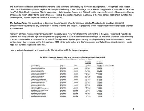 and maybe concentrate on other matters where the state can make some really big moves on saving money.” Along those lines, Rieber called for a district court system to replace the multiple -- and costly -- town and village courts. He also suggested the state take a look at the New York State Health Insurance Plan to save money. Late Monday, Cuomo and DiNapoli held a news conference in Albany where Cuomo announced a “heart attack” to the state’s finances. “The big drop in state revenues in January is the most serious fiscal shock our state has faced in years," State Comptroller Thomas P. DiNapoli said. The SullivanTimes has reached out to Governor Cuomo’s press office for comment about AIM and asked if Monday’s bombshell announcement would impact any restoration of funding to towns and villages. At press time today, Rieber weighed in on the state’s shortfall announcement. “Certainly all these high earning individuals didn’t magically leave New York State in the last months of the year,” Rieber said. “Could it be possible that many of these high earners preferred paying taxes in 2019 in the hope that there might be a reversal of the tax code reflecting how much state and local taxes can be deducted? Earnings were high last year for many people particularly those in the markets. I would venture to say that revenues for the first quarter of 2019 will be quite higher and this ‘emergency’ shortfall will be a distant memory. I would hope that our state legislators stand fast.” Here is a chart showing Aid and Incentives for Municipalities (AIM) for the past two years