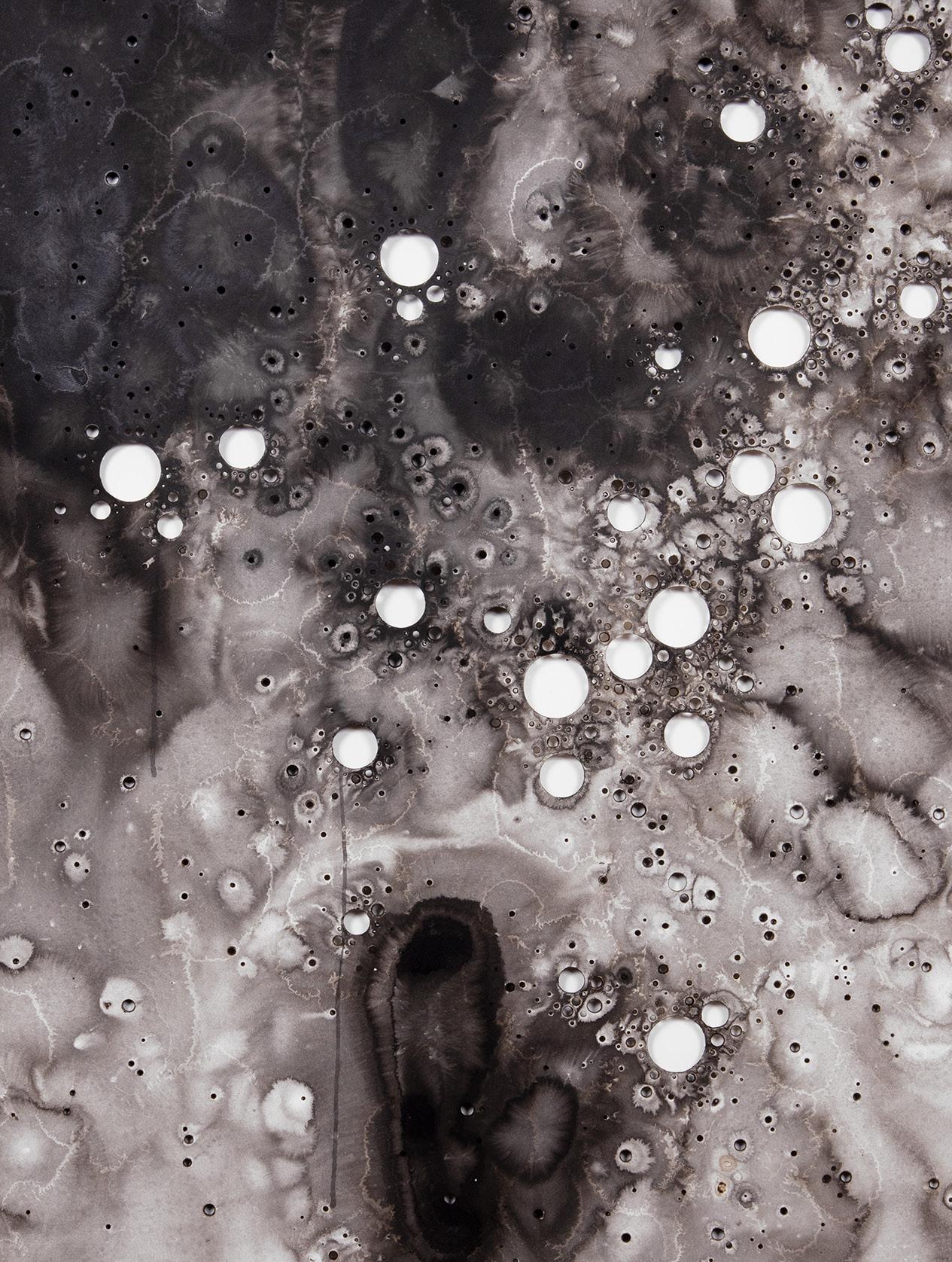In Lee’s fire and rain drawings, collaborations with natural forces are realised through mindful engagement with the elements. Inspired by Zen & Taoist cosmology and philosophy, the drawings are meditations on interdependent, cyclical, and generative interactions. In reference to Indra’s net, and to indicate infinite connecting points of celestial light, countless perforations are scorched into paper marked by fire and trailing smoke. Some works are offered to the rain and as it falls, Lee responds and enhances the mark with a flask of Chinese ink that swirls and surges before settling. Hereafter, as light passes through each delicate aperture, we are reminded of the vastness of the cosmos and the interconnection of all things. Through her multifaceted and expansive practice, Lindy Lee reminds us of the immensity and wonder of the universe and the dynamism of life.