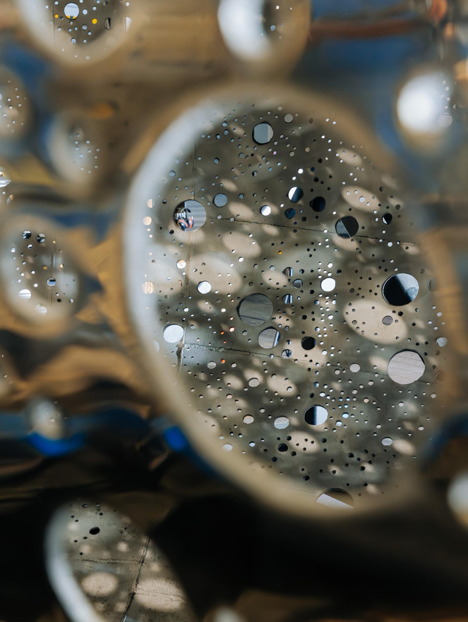 During the day, the mirror-polished stainless steel absorbs and reflects the imagery of life, of people, trees, passers-by, birds, clouds scudding across the sky, the rich yet transitory imagery of the floating world. Viewers engaging with the work can literally enter into it, a good four meters into the belly of the beast, where the perforations of the stainless steel skin bathe them in pinpricks of daylight entering the darkness.