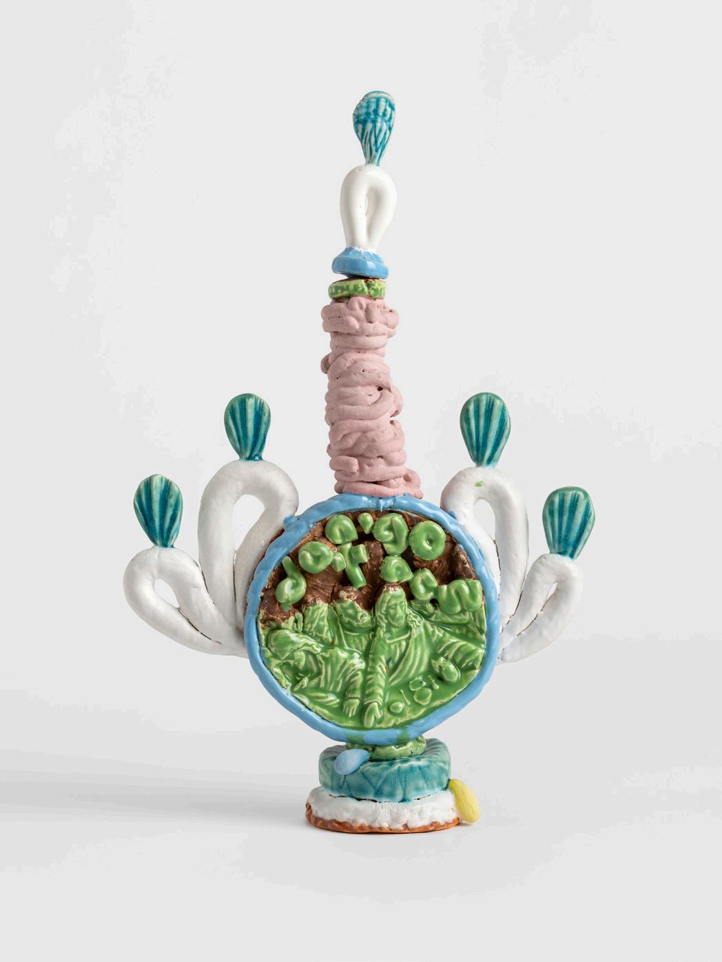 These new works, with letters of words forming the walls of the vessels, are also about Barkley embracing the nonfunctional nature of his works. Previously, although the works were rarely waterproof, Barkley made vases and other ‘functional’ shapes. Recently realising that these vessels are not functional after all, he has embraced the denial of function completely. The new open-formed vessels in this exhibition mark a shift, creating a new typology for the artist that is more closely aligned to sculpture than pot-making.