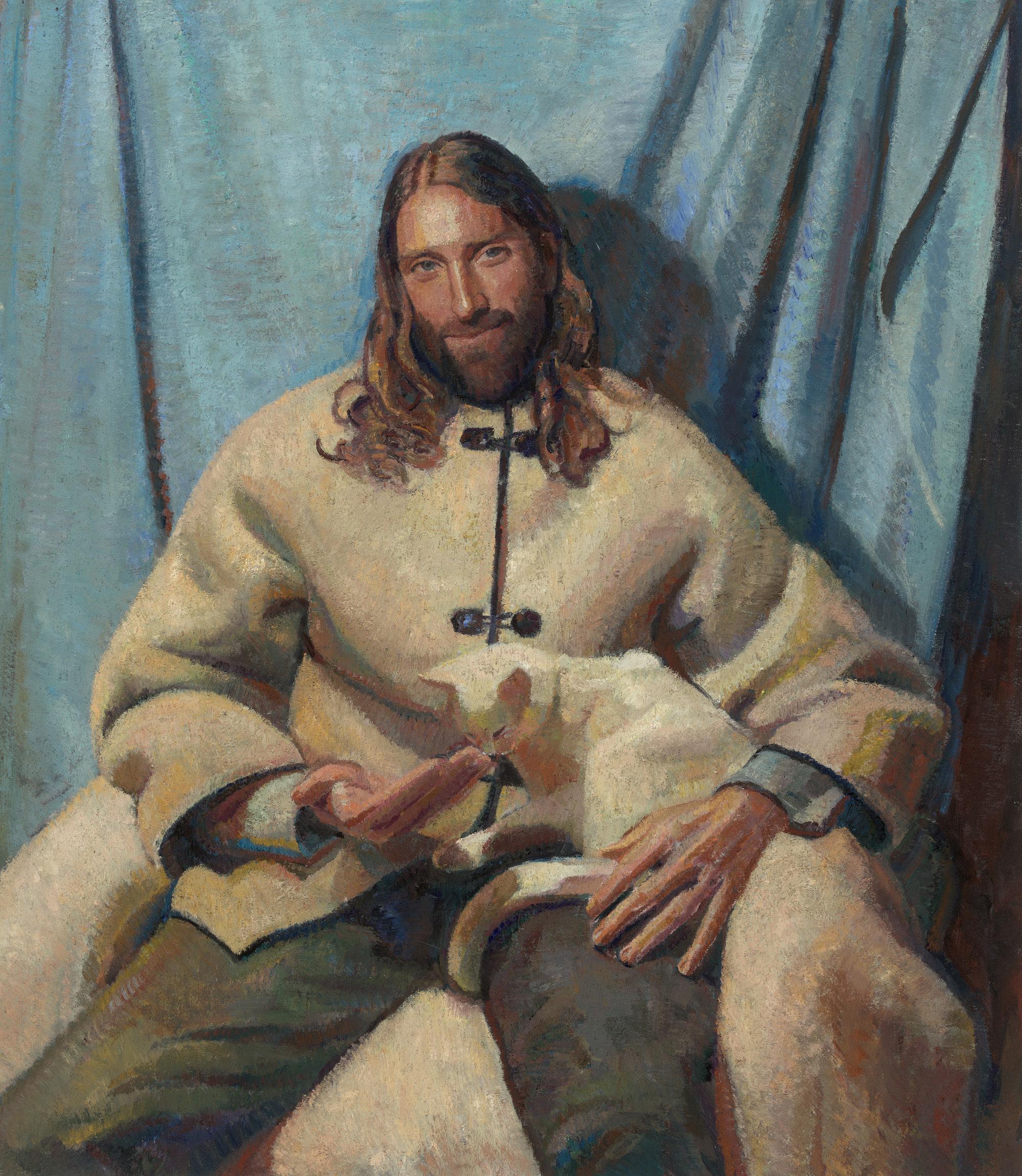 Seated portrait feeding cat 2024 Oil and sand on jute 113cm x 97.5cm