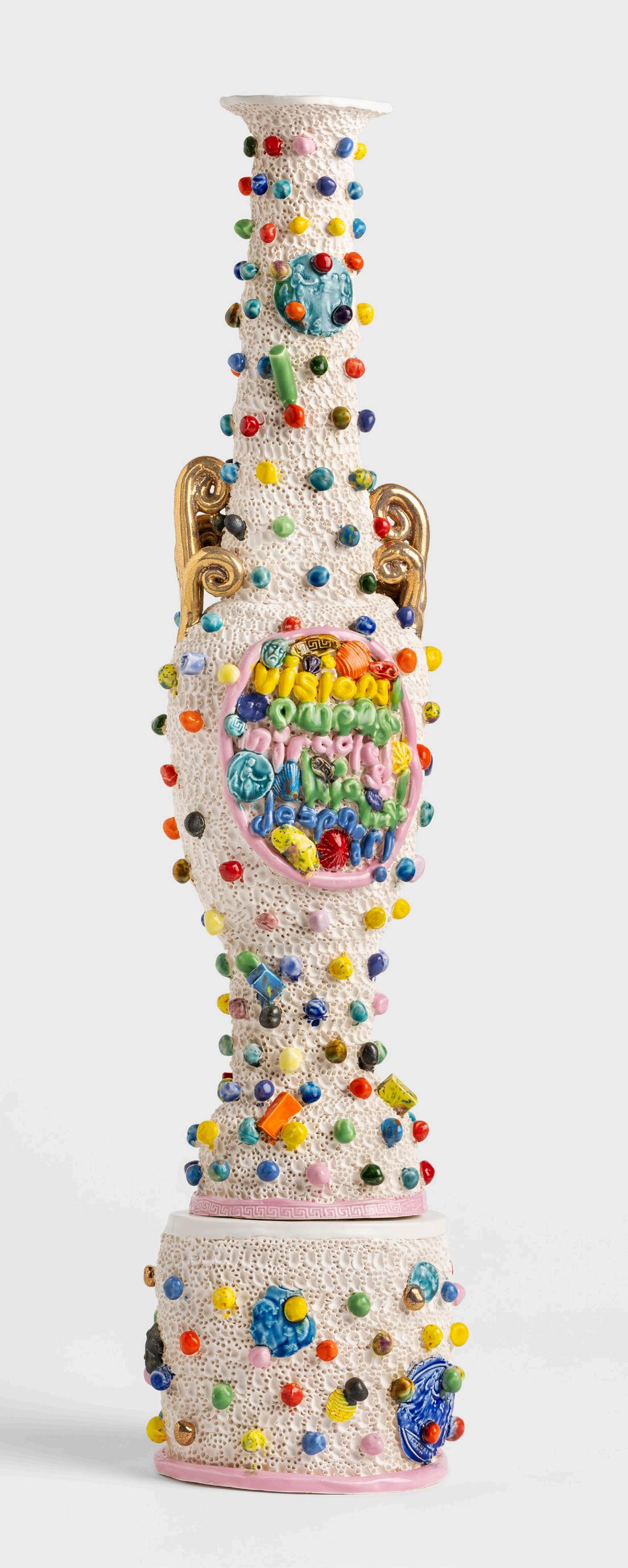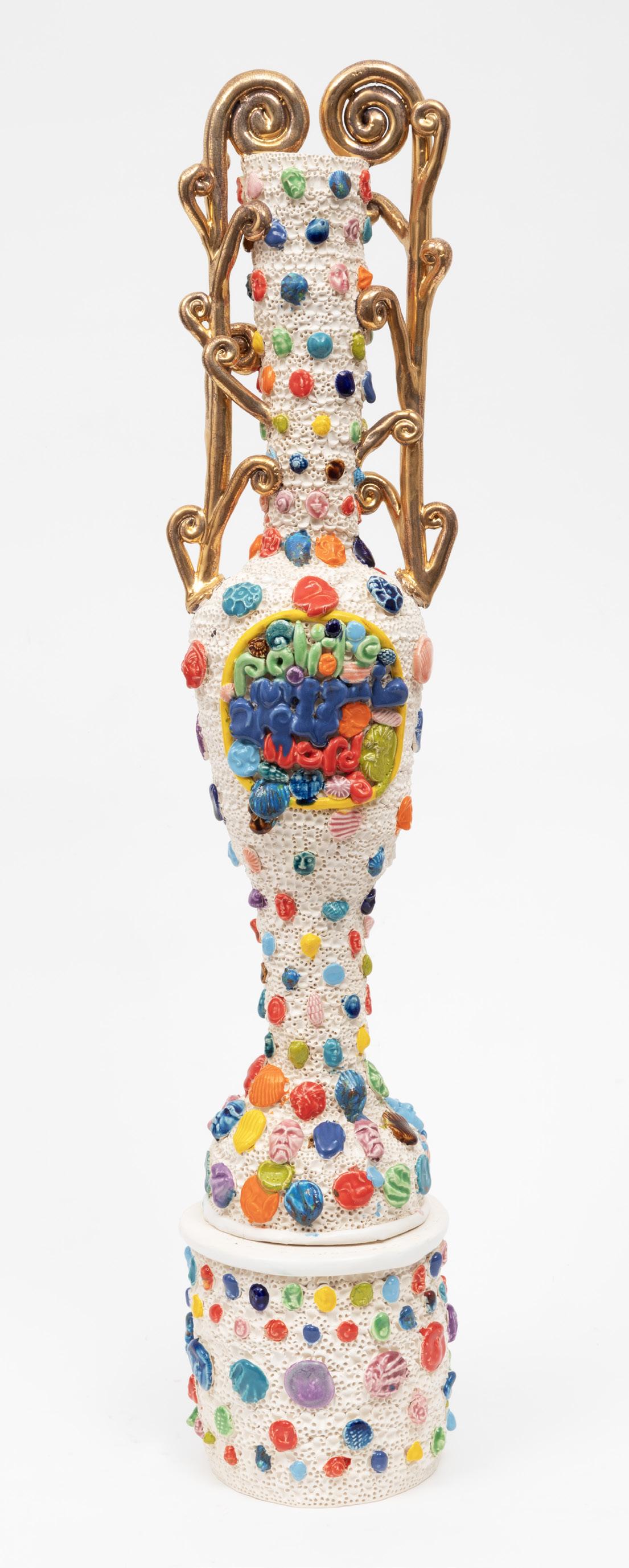 Glenn Barkley, visions!omens!miracles!highs!despair!, vessel with golden curl handles, 2024, earthenware, 77×17×16 cm
