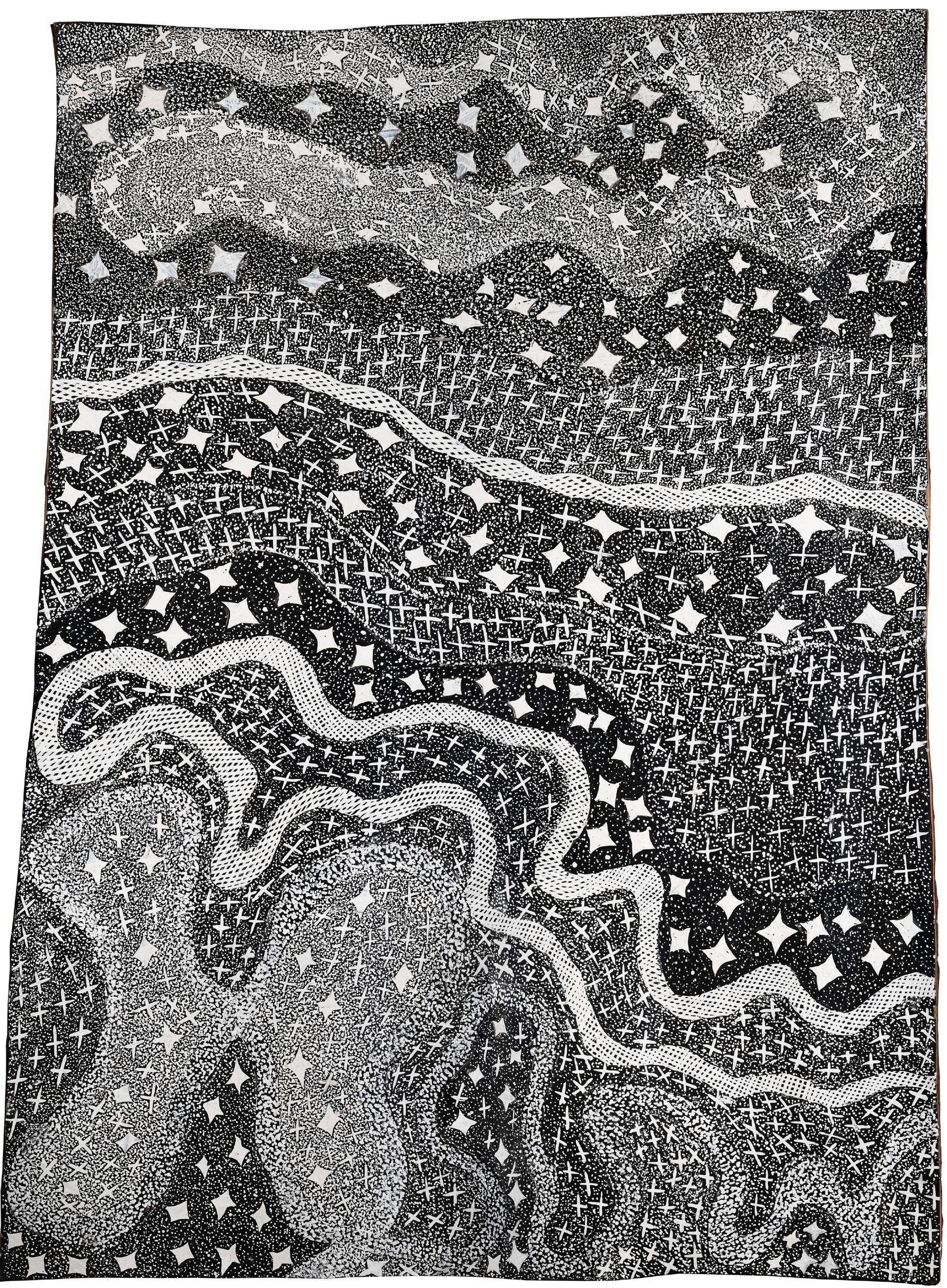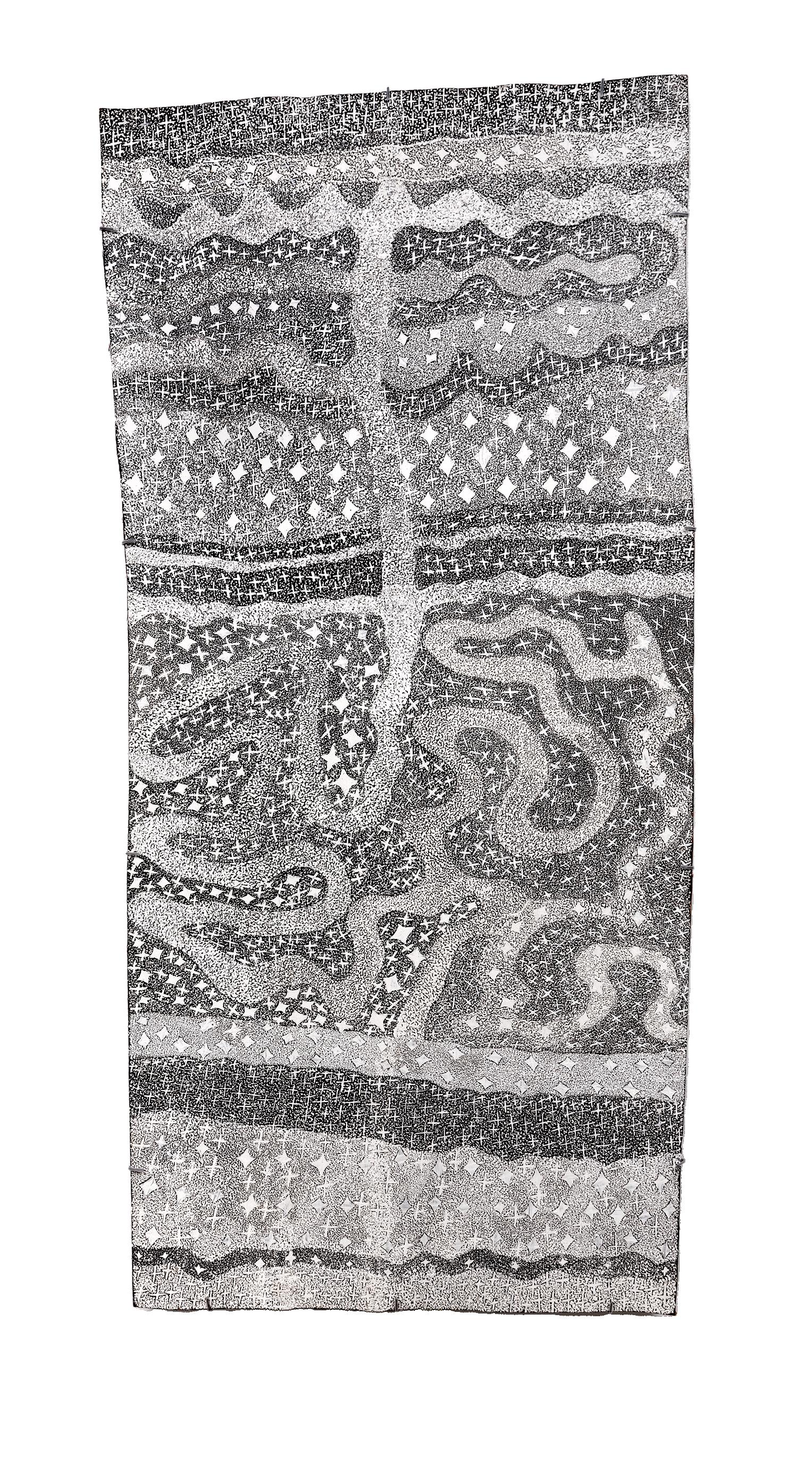 Naminapu Maymuru-White, Milŋiyawuy River of Stars, 2024, natural earth pigment on bark, 122×92 cm