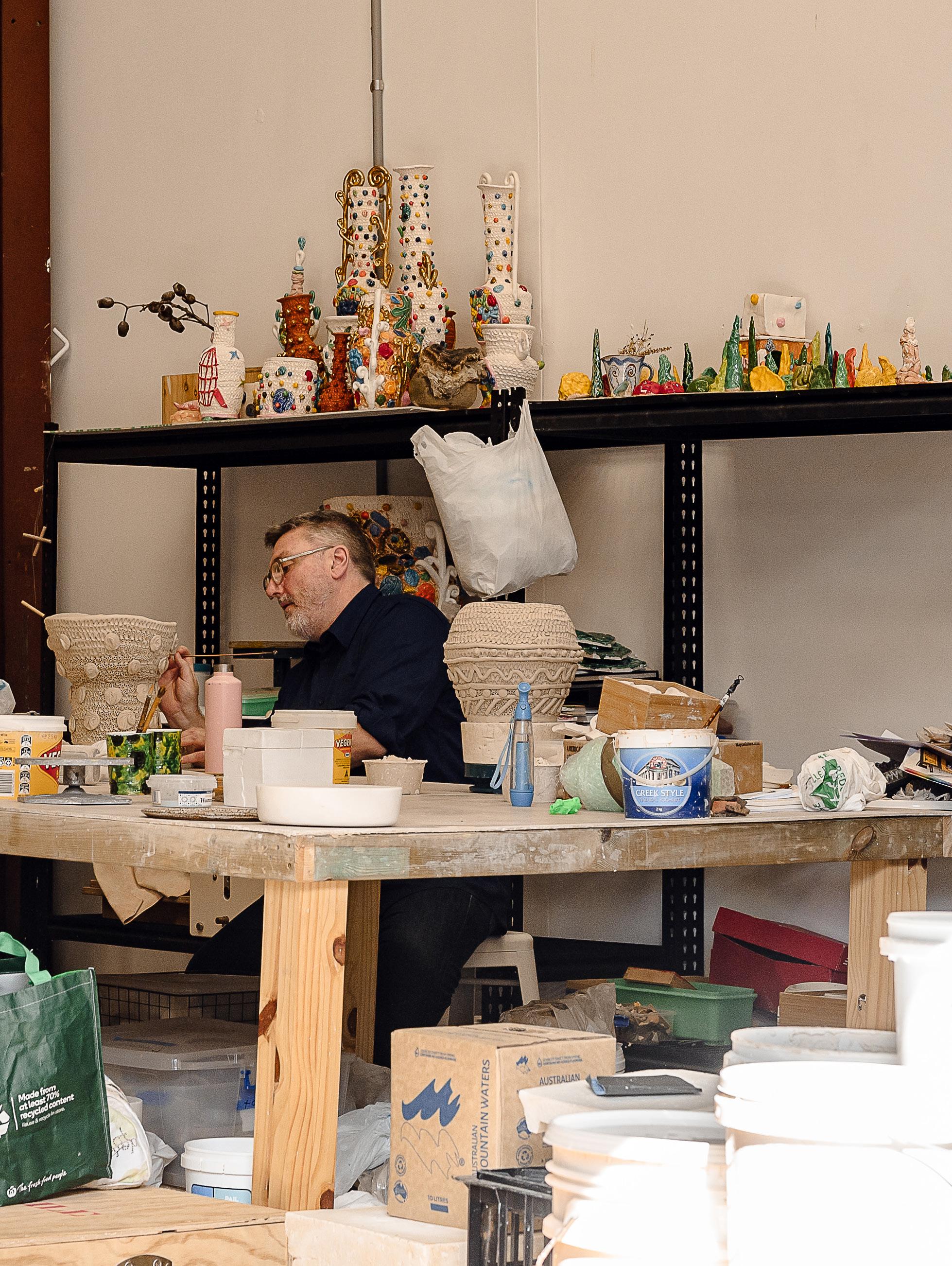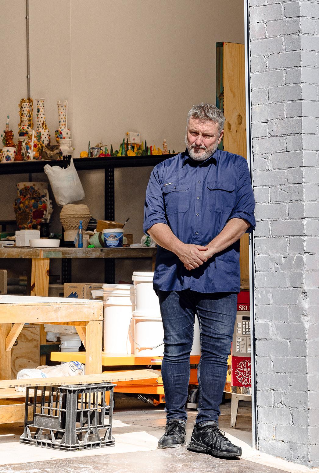 Glenn Barkley is best known for his exuberant, colourful, amorphous vases, pots and sculptures. Using vessel shapes, often inspired by ancient Greek artefacts such as the amphora, he then adds a layer of sculpted embellishment. These might be written words in oversized, crudely formed letters or they might be shells, birds or other “tokens” — roughly disc-shaped ceramic pieces decorated using moulds with coins, medallions, and friezes of famous works of art and architecture. Each of these tokens provides clues as to the wide-ranging interests and passions of the artist. Part of the inspiration for Barkley’s new body of work came while unpacking a box during a house move. There he found one of the first things he ever made in clay. He holds it up for me in his Annandale studio one cloudy afternoon in winter. Glazed in a uniform white, the piece is obviously old and a little worse for wear, but the form is distinctive — a series of simplified letters formed in clay coils and stacked on top of each other with a slab base to create a vessel. Barkley’s new pieces incorporate the same sausage-like clay letters in stacks to create a vessel with those same open forms. This time, however, the letters are interspersed with his tokens creating a jigsaw of symbols, images, and meaning. Each pressed clay token comes from a different time and place: an Egyptian Pharoah’s bust (the mould is a cheap souvenir he picked up while travelling), the Parthenon in Athens, a kookaburra, old coins. Some are self-explanatory and others have a longer story — a mould of the Sydney Cove medallion, a rare artefact originally made from dark grey clay collected in Sydney Cove in 1789 by Governor Phillip, who passed it to Joseph Banks, who passed it to Wedgwood, who made the clay into a series of limited-edition Medallions.