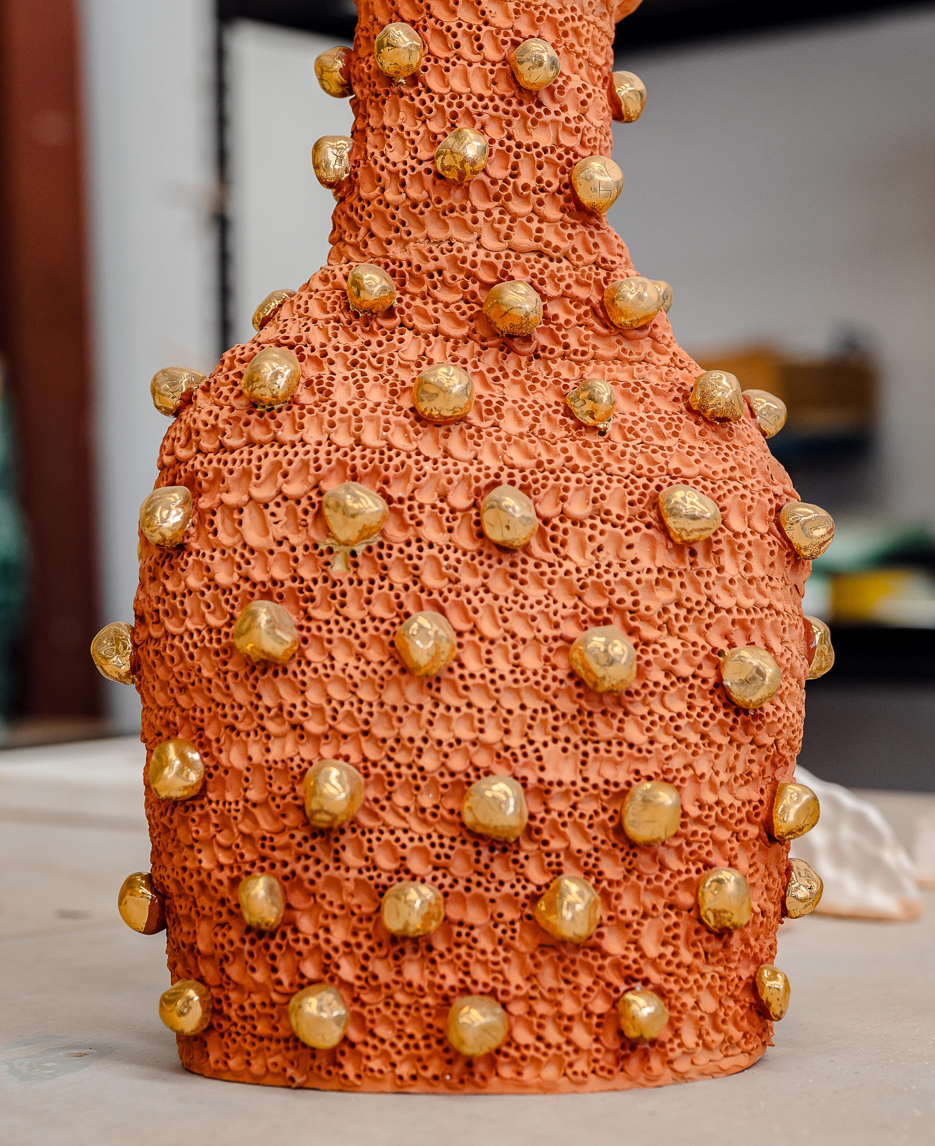 Glenn Barkley, Flat bottle with pox and golden balls, 2024, earthenware, 34 x 19 x 12 cm, photograph by Ainslie.Co