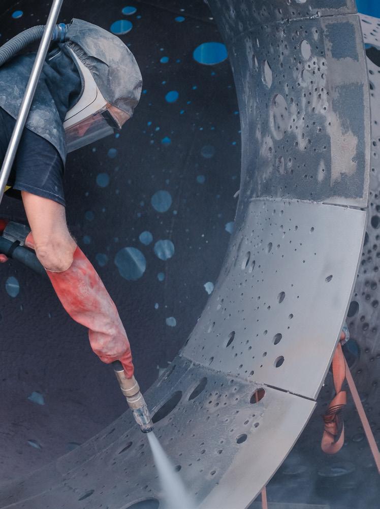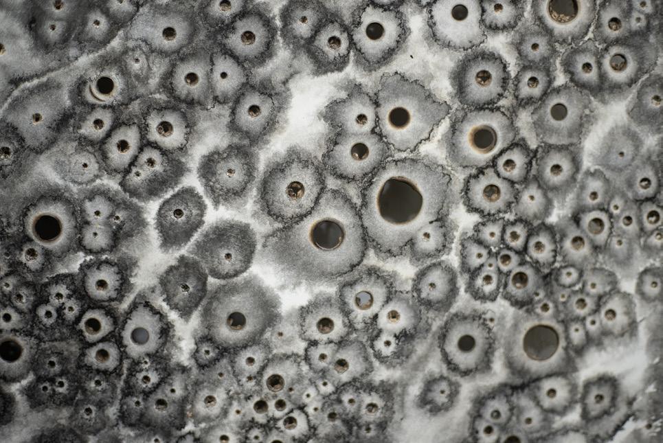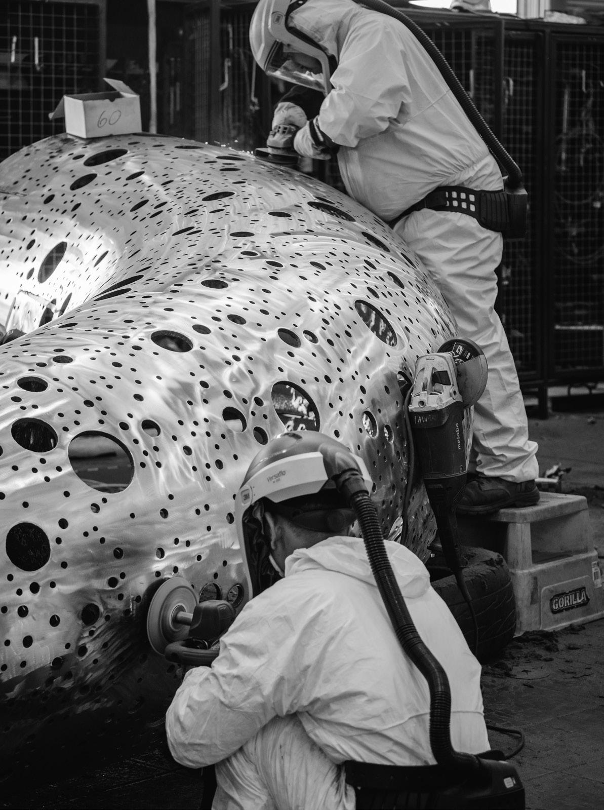 Perforations on the surface of Ouroboros on site at Urban Art Projects (UAP) foundry, Meanjin/Brisbane. Photograph Josef Ruckli.