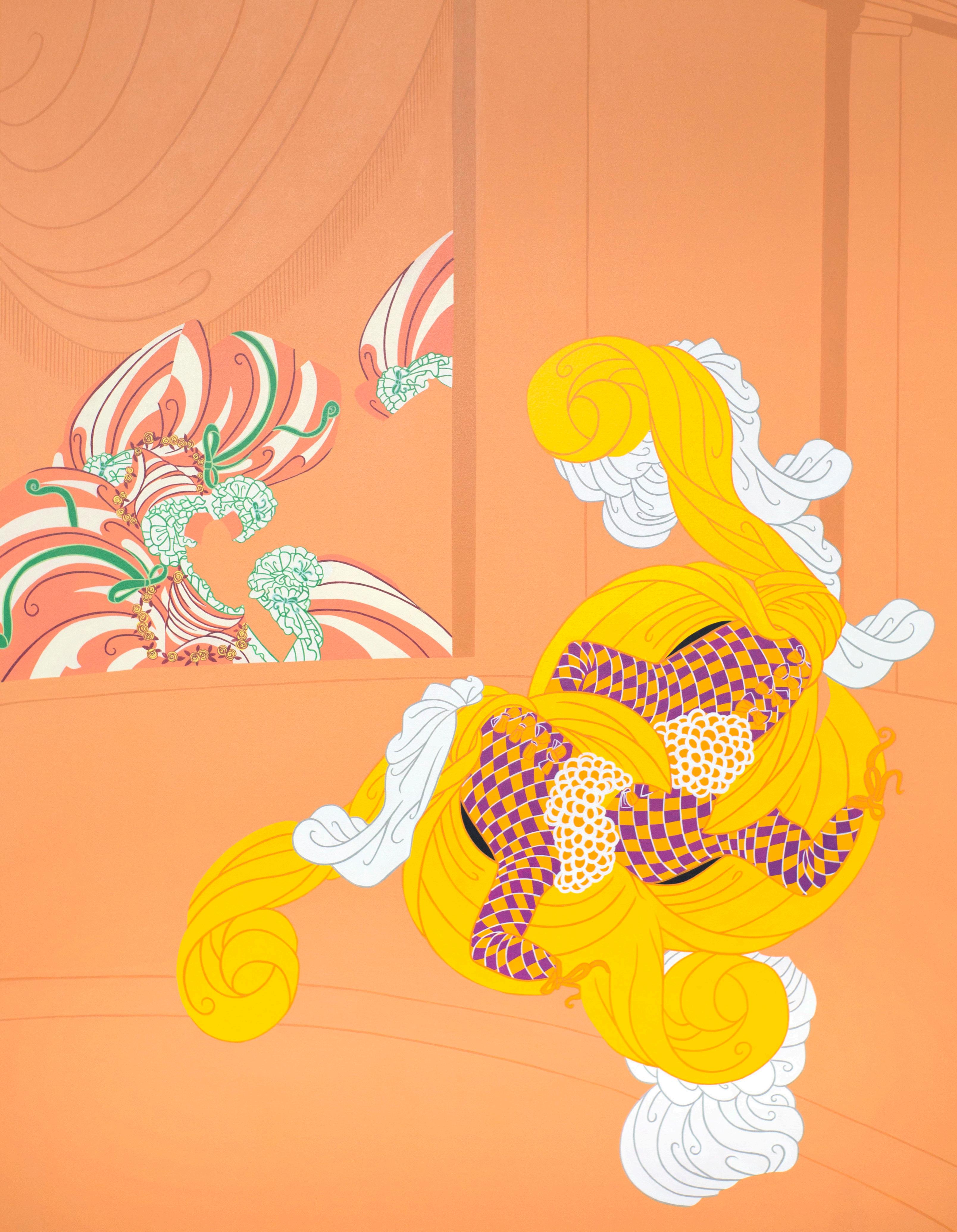 He does this using specially handmade tools and brushes, working from illustrations and photographs that are digitally collaged before being painstakingly recreated in paint. These layered compositions convince as collage, with Hodge’s use of shadows and sharp edges reinforcing these intellectual as well as visual collisions, with forms and shapes seeming to hover and stack. The foremost layer of Hodge’s paintings though are the ribbon-like painterly gestures that move across the surface of the composition, standing in for figures, fabric and other restless forms. In paintings that appear to grapple with wanting to be representational, these gestures are designed to disrupt any coherent reading of the symbols and surfaces, and to return these densely packed paintings back to the subject and experience of painting.