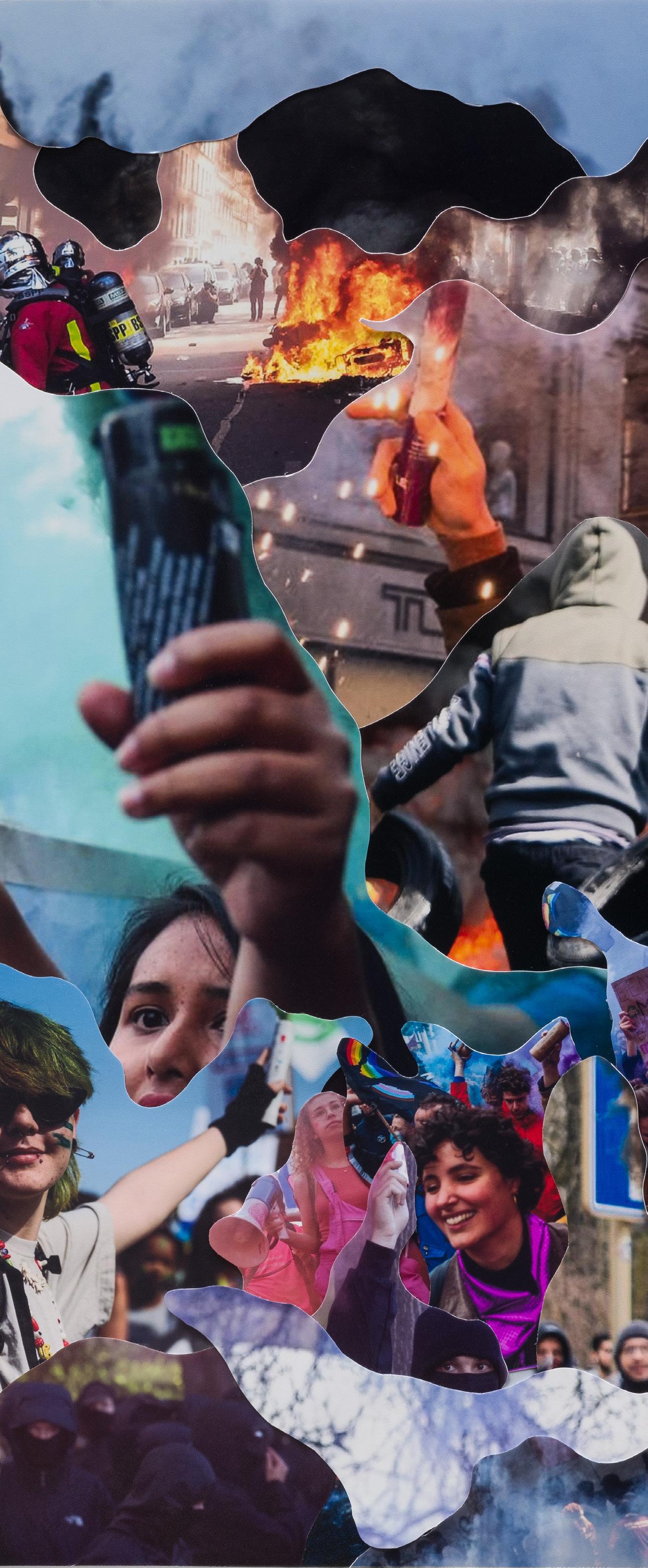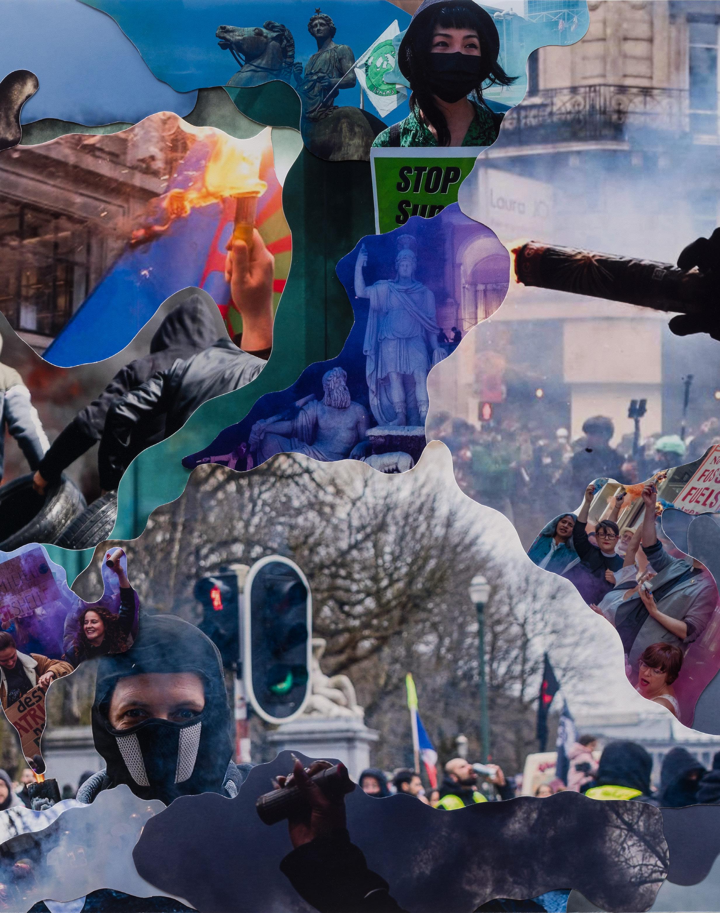 A photograph is also the product of trapped light. Jemima tells me she makes photocollages in cycles of three to six months. She scours the internet for smoke emanating not from wars but protests. The wisps, plumes, and clouds of smoke are woven into a single image. In cutting and arranging the photographs, she accentuates the billowing effects of smoke as it expands. What is striking about the newest works in Jemima’s Haze series is their galactic, psychedelic qualities. In Haze 14, the smoke stretches and magnifies bright colours: yellow, lilac, blue, pink, orange. These artworks remind me of the Hubble Space Telescope’s slow exposure images of the cosmos, revealing deep, swirling patterns, stellar nurseries, and giant pillars of gas and dust. Sifting through the smoke, one might locate fragments of bodies and objects: a person in a balaclava, a high-vis vest, a riot shield, an arm hurling a tear gas canister. Little figurative spots fracturing the surface of the image. To me, it makes sense to think of sunspots as people under pressure. People who join with other people to express their anger and frustration on the streets.