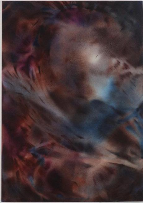 Merrett’s work is immersed in materiality; her cotton canvas, her myriad paints, her brushes are all tangible. The work smells. The work spills. The work stains. Her paintings are consistently informed and inspired by the bush at Manyana on the NSW south coast, the forest at Kangaroo Valley and the intertidal zones of Bondi beach. Yet, there are other insouciant or other-worldly elements at play, such as a random breeze through the studio or the luck of the perfect drying day. These earth, air and water elements are energetic parts of the artist’s ecology.