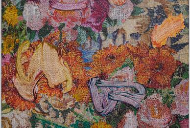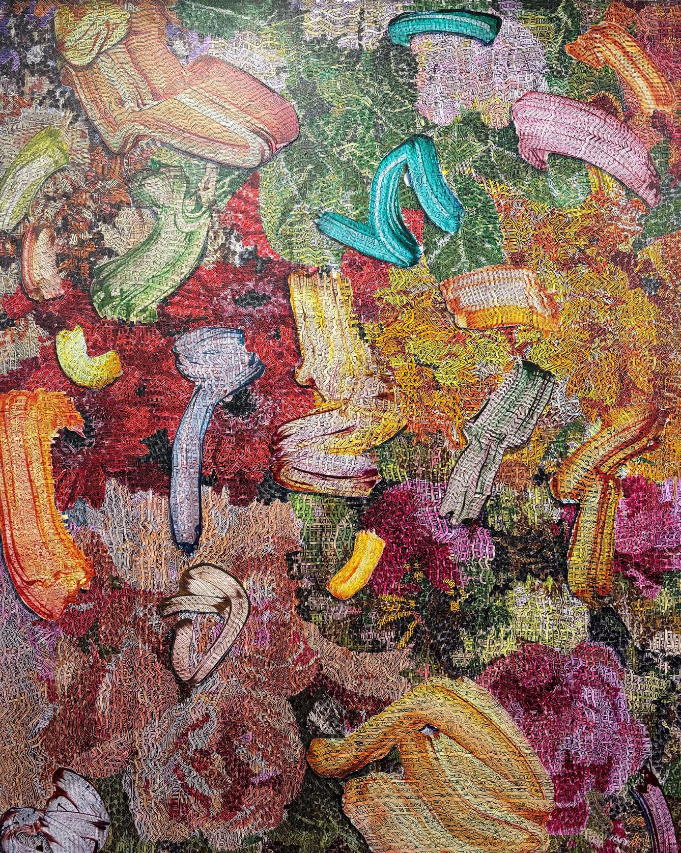 Gregory Hodge is an Australian artist based in Paris, France. His paintings oscillate between abstraction and figuration, layering personal source material with painterly gestural marks and obscured motifs of foliage, interiors and architecture. With an ongoing interest in how to render different material surfaces in paint, Hodge’s recent works eschew a slick, pop finish for a deliberately handmade quality designed to resemble the warp and weft of tapestries and other woven materials.