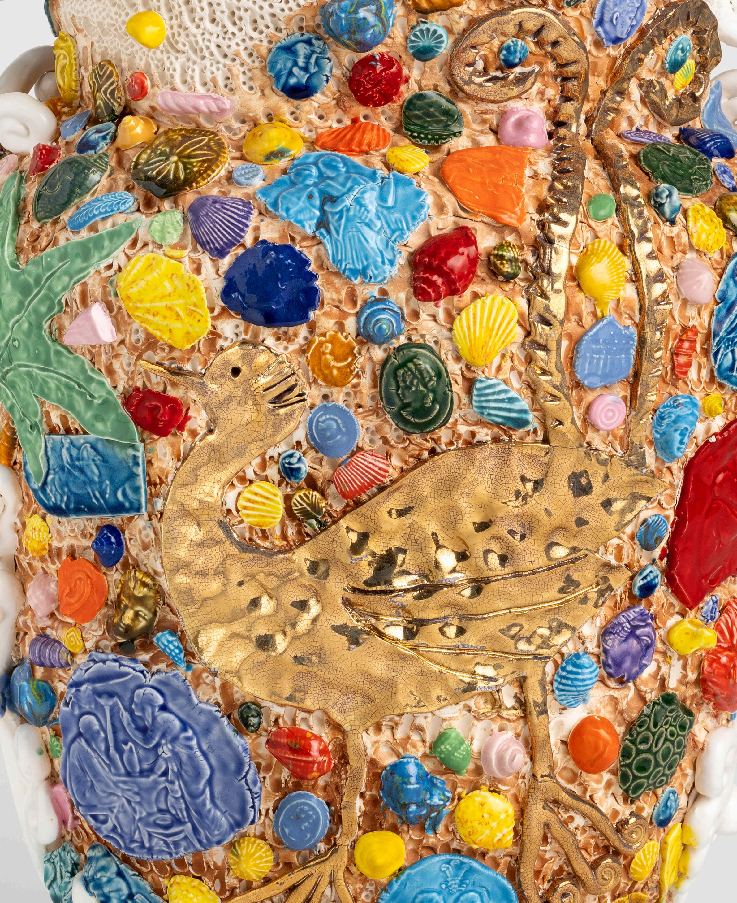 Glenn Barkley, Portland Lyrebird Vase with Sydney Cove Medallion, 2024, earthenware, 70×30 cm, photograph Aaron Anderson