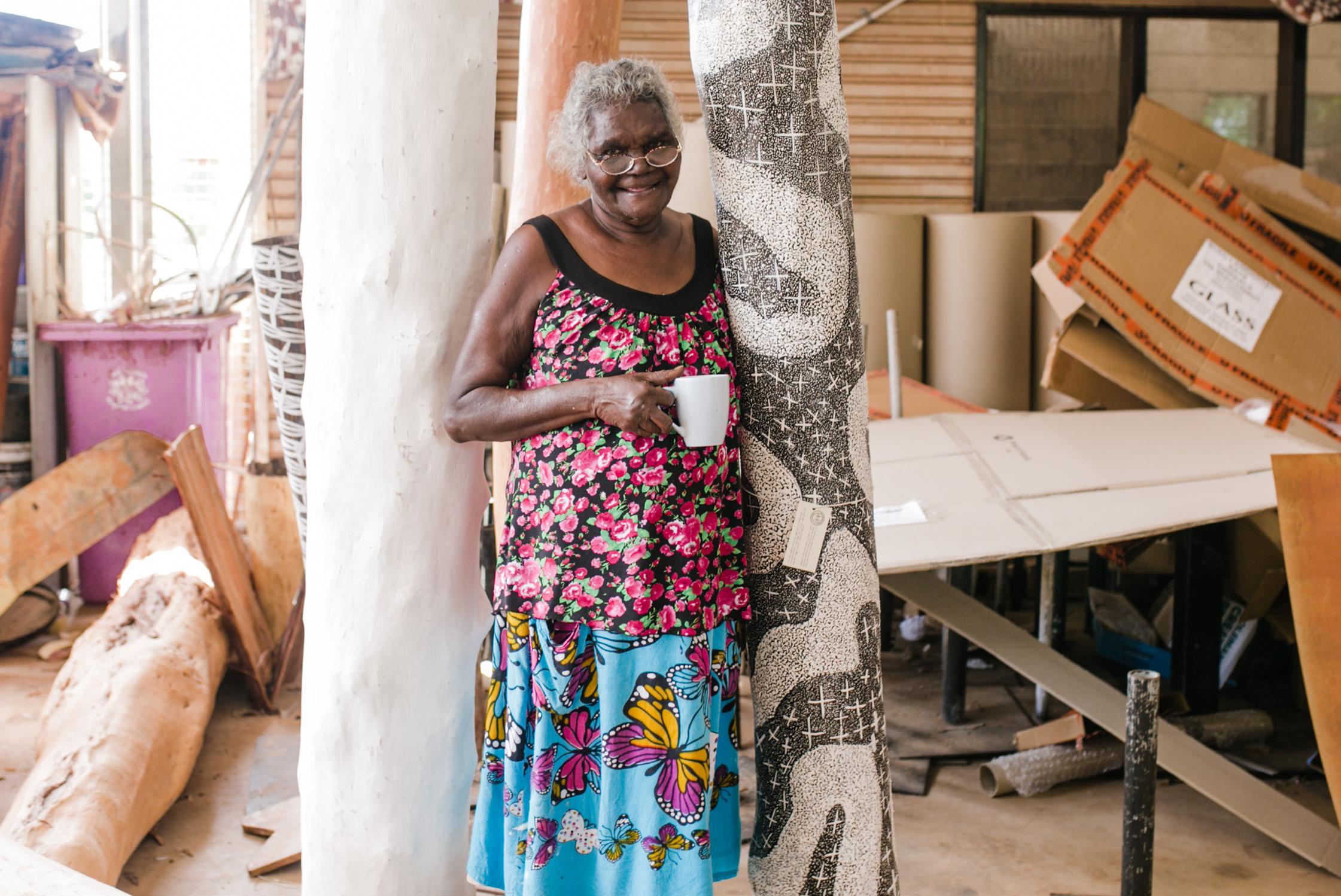 Portrait of Naminapu Maymuru-White in the studio, 2024, photograph Leicolhn McKellar