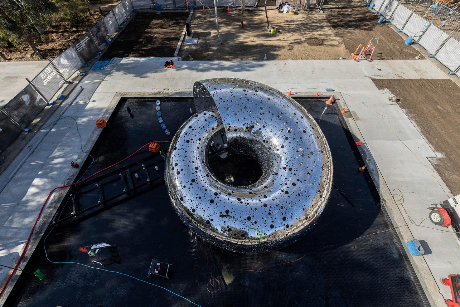 Left: Fabrication of Ouroboros at UAP foundry, Meanjin/Brisbane. Photograph by Josef Ruckli. Courtesy the National Gallery of Australia. Left inset: Ouroboros with surrounding landscaping underway onsite at the National Gallery of Australia, Kamberri/Canberra. Photograph Sam Cooper, courtesy the National Gallery of Australia
