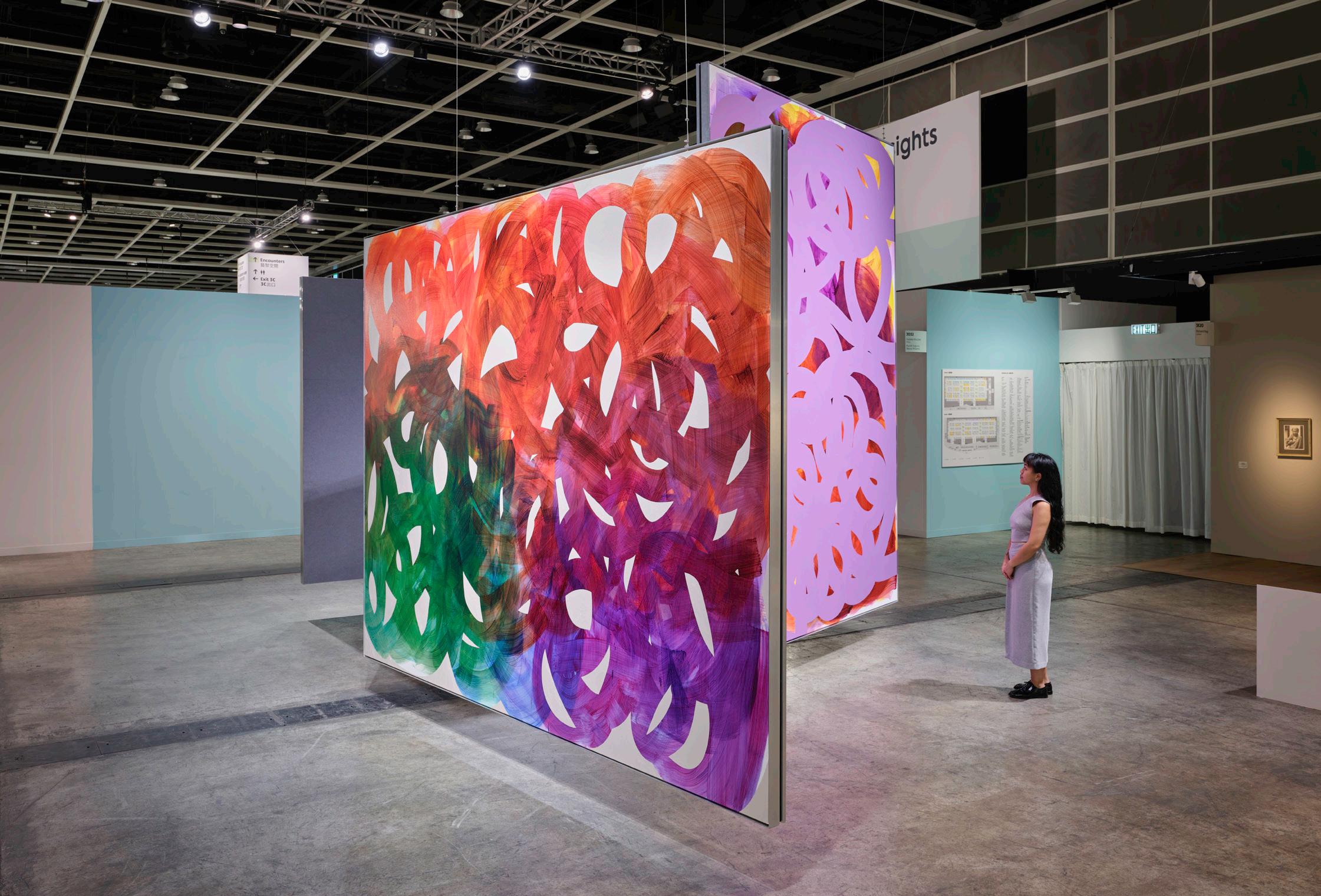 Above and below: Gemma Smith, Shadow Paintings, 2025, acrylic on canvas, each 280 × 380 cm. Installation view, Encounters, Art Basel Hong Kong 2025. Photography by Phillip Huynh.