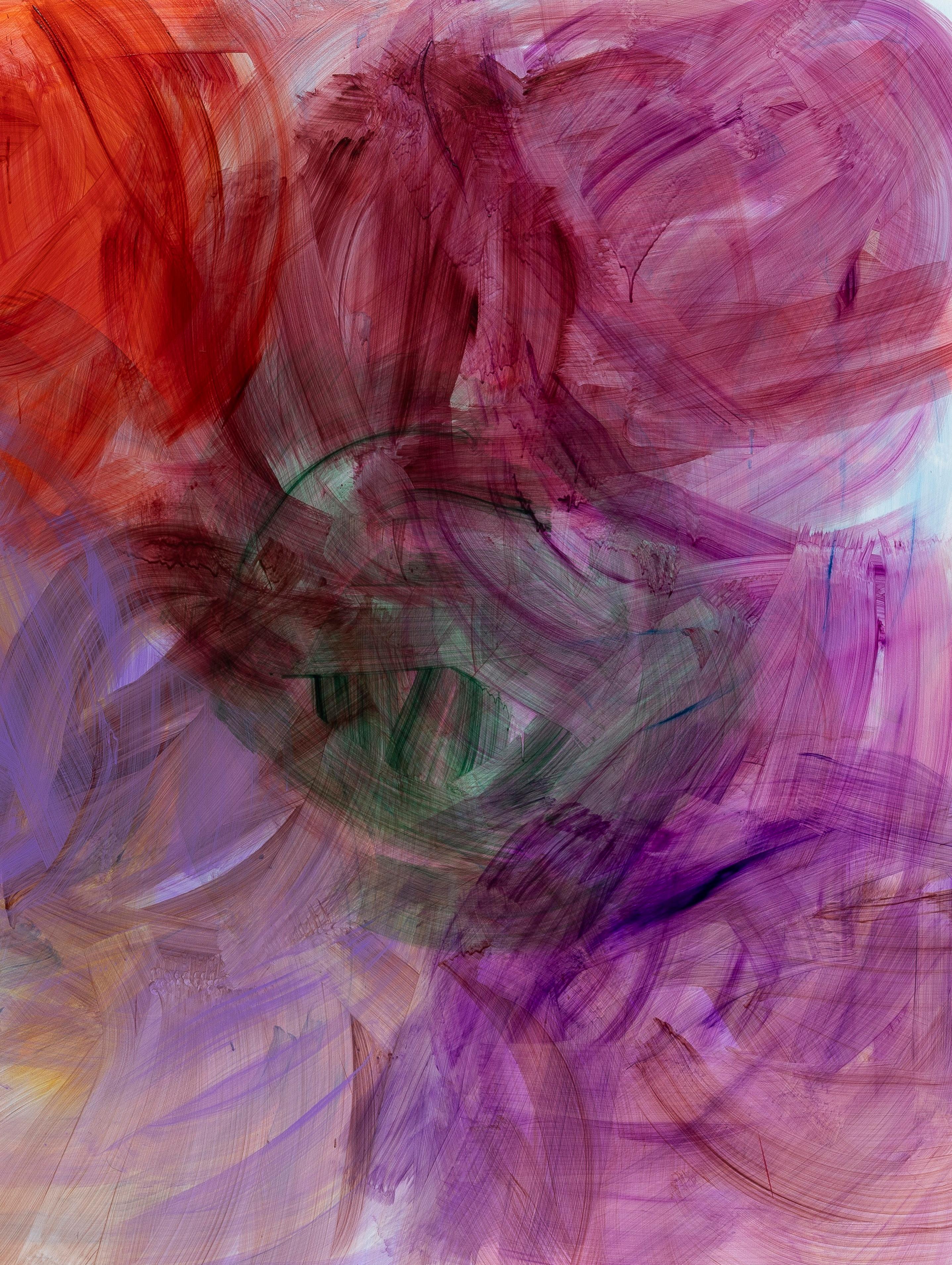 quick washes of translucent colour that swipe over and through each other in what may appear like spontaneous gestures. In reality, they are formed through methodical accumulations of colour, stratified surfaces that index marks made over many weeks, months and even years. There is an obsessive calculation behind the paintings’ plums, corals, raspberry reds, forest greens and ambers, with careful punctuations of hot pink or acid green. Smith is, of course, a dedicated student of colour. (During a residency at Bundanon, she precisely colour matched the tones of her natural environment, now documented in a small book of colour swatches filled with variations of moss green and eucalyptus grey). Sometimes, these colours rest on the canvas in gradual superimpositions; elsewhere, the paint bundles in defined forms that inch towards each other, like a patchwork hovering into formation.