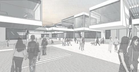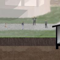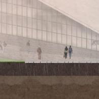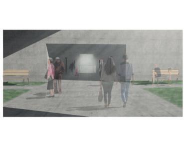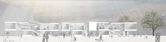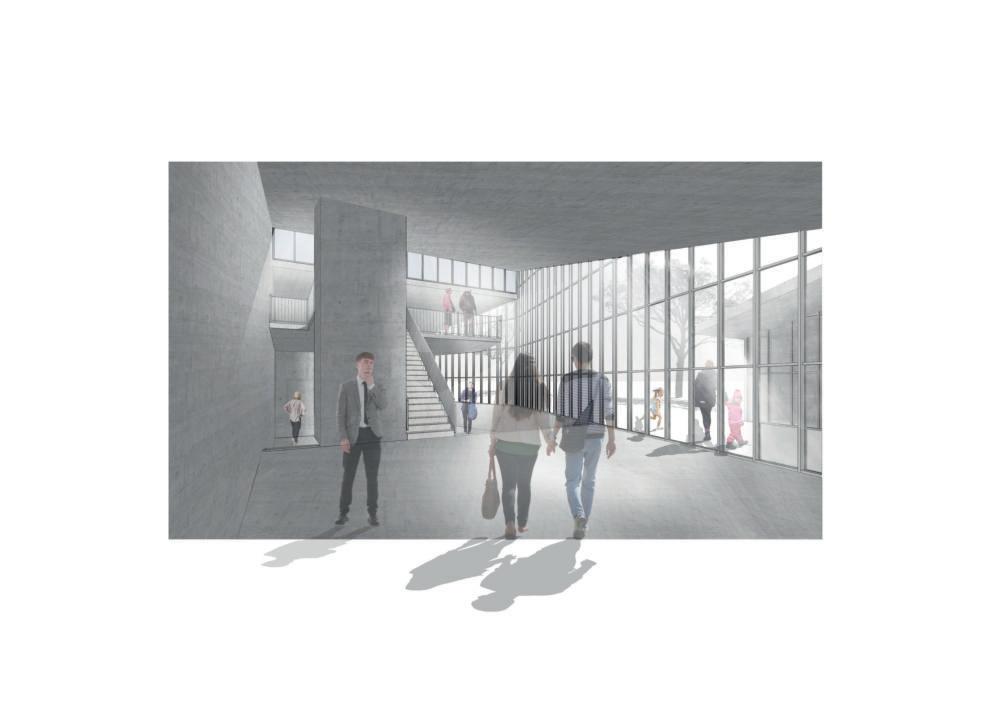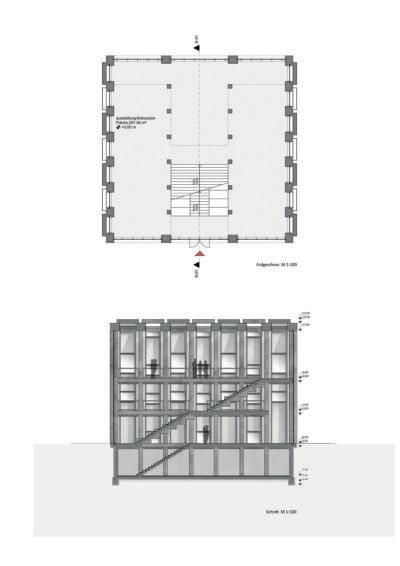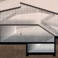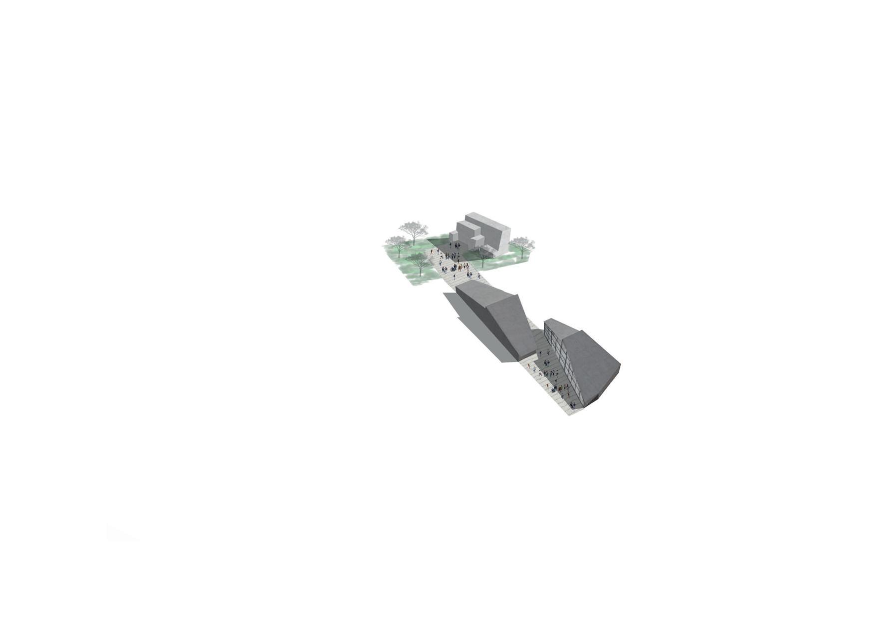 ImErdgeschosssinddieMarktstände,Jugendzentrum und Veranstaltungsraum vorhanden. Die Zusatzfunktionen und der weitergeleitetenVeranstaltungsraumsindimObergeschoss geplant. Die Cluster sind so angeordnet dass in einem Cluster vier Marktstände untergebracht werden können. Im Oberengeschoss sind Terrassen und Durchgänge vorhanden, die durch die Verschiebung und der Versetzung von der Baukörper entstehen. Die Terrassen und die Durchgänge ermöglichen im Obergeschoss eine durchlaufende Stadtebene, die den Erdgeschoss widerspiegelt. Durch die Verschiebung nach außen, indem die Durchgänge entstehen, werden im Obergeschoss wegen Durchbrüche kleine Gäste erzeugt. Damit es eine Blickbeziehung zwischen Obergeschoss und Erdgeschoss entsteht.