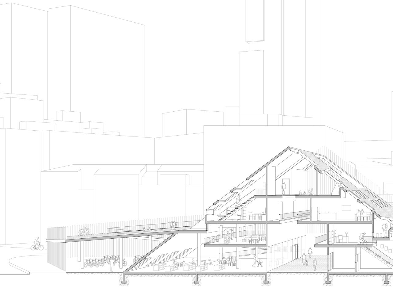 Slope House takes on child-centered housing and childcare by investigating how play can be integrated into everyday life with a dynamic roof as a place for free play. By sharing a roof, the residents share childcare as a collective responsibility, evoking Jane Jacobs’ “Eyes on the Street.”